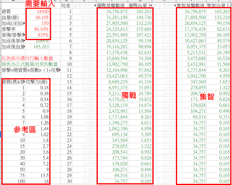 - 參考區是我以暴傷800%、買高級加成,計算出M萬資質時,暴擊時攻擊力有多少,單位是億。