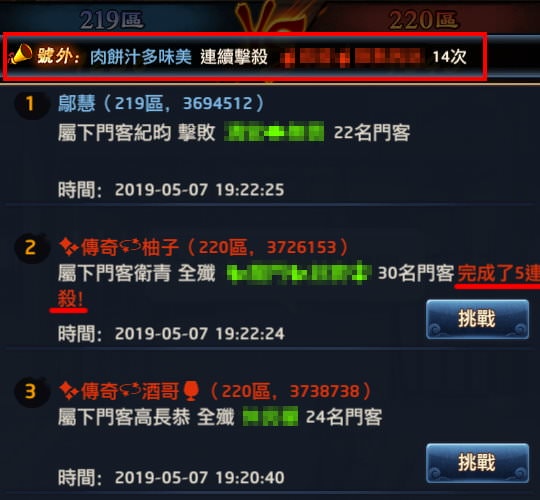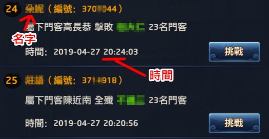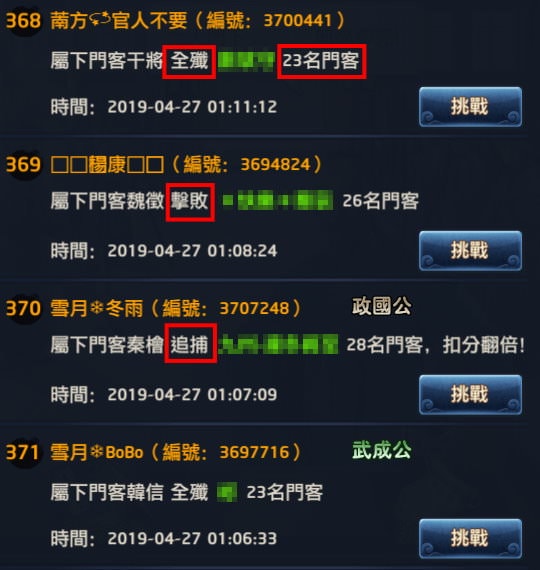 1, 我會先從上榜名單上找出門客數量多的,從某個玩家(綠色字體)被打的訊息中,若是「全殲」,後方的數字就是對方的總門客數量,若沒有「全殲」字樣,表示對方門客數不只那個數字。