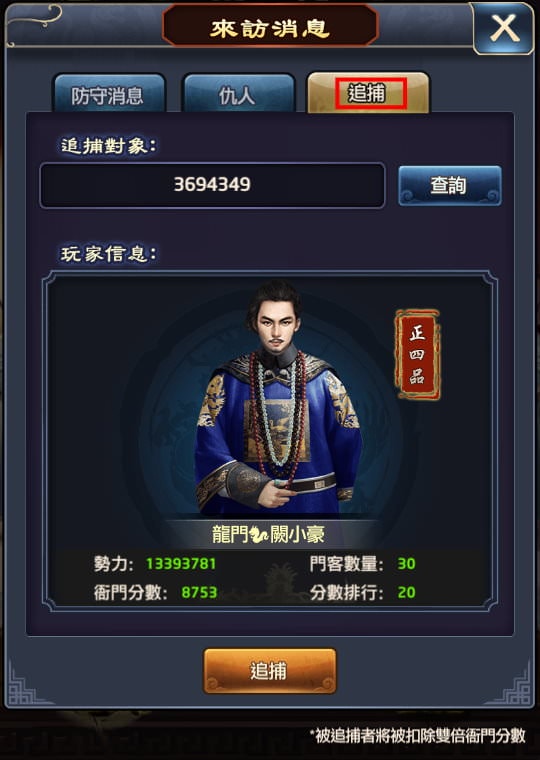 3, 若對方在榜上,不管有沒有追捕令,不管是服內競賽或區服,都可以用「追捕」來查詢,使用追捕功能時,可以看到對方的四個資訊:勢力、門客數量、衙門分數、分數排行