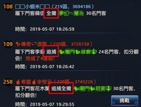 另外要注意到,若某個人在榜單上都是被「追捕」或「追捕全殲」,表示這個人有可能是區服第一天被當肉餅,第二天已經知道不能上榜了,但還是持續被有「追捕令」的玩家追殺。