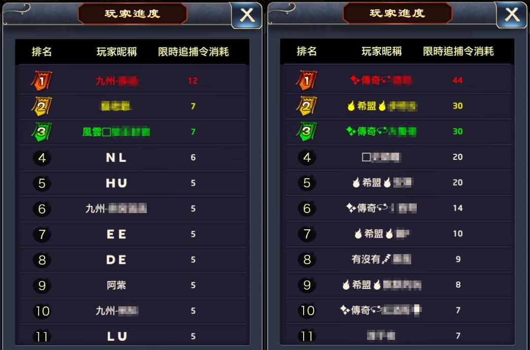 至於要怎麼查上面這份資料,你得在兩服都有創建角色,然後點 限時獎勵 > 限時挑戰書消耗 / 限時追捕令消耗 > 玩家進度,就能看到。