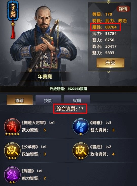 像我當初為了解主線任務,把沒有要練,資質13的年羹堯升到150級,靠封爵服裝加了600書籍經驗,又花了4個書籍經驗包,把他的資質加到17。但總資質低,加上不會餵他屬性丹丸,他的血量也不會多。