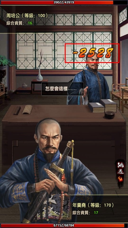 開戰前使用「臨時攻擊加成50%」,資質17的門客攻擊力就變成 2,550 ± 10%,但光打一個100級、資質16(大概也是對方為了解主線任務升級錯的門客)就耗掉半條血,往往第二場就輸了。