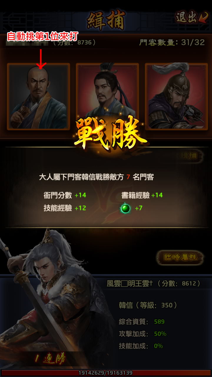 步驟3, 接著看能打贏幾位門客,會瞬間(1秒左右)完成,也會自動賺取「連勝獎勵」。