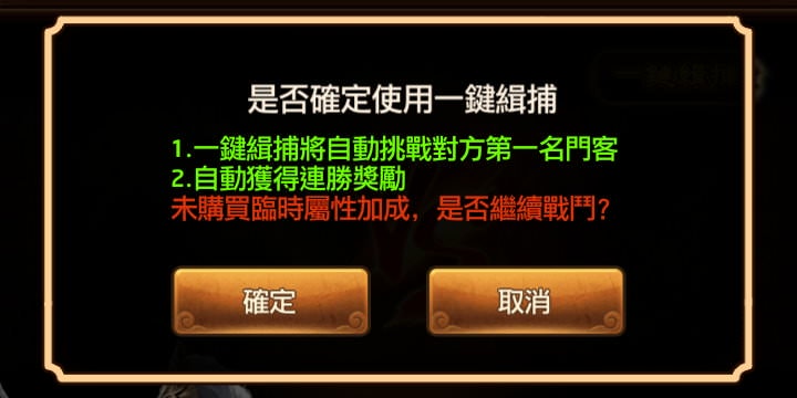 儲值等級達到「VIP 6」或以上,可以在衙門對戰過程使用「一鍵緝捕」功能。