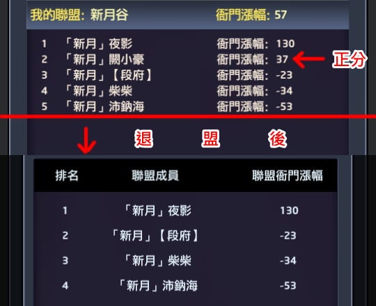 | 2, 本來就已經待在聯盟裡,這段時間的分數漲幅,若是正分,退出聯盟後會扣除,但如果是負分,退出聯盟後並不會扣除。 |