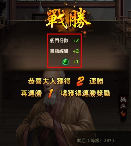 而衙門每打贏一個門客就+2書籍經驗,打贏20個就+40書籍經驗,加上每贏3場有「連勝獎勵」,贏21個門客就能抽獎7次,每天能靠衙門增加的書籍經驗其實跟書院差不多甚至更多,而且是很穩定的書籍經驗來源。