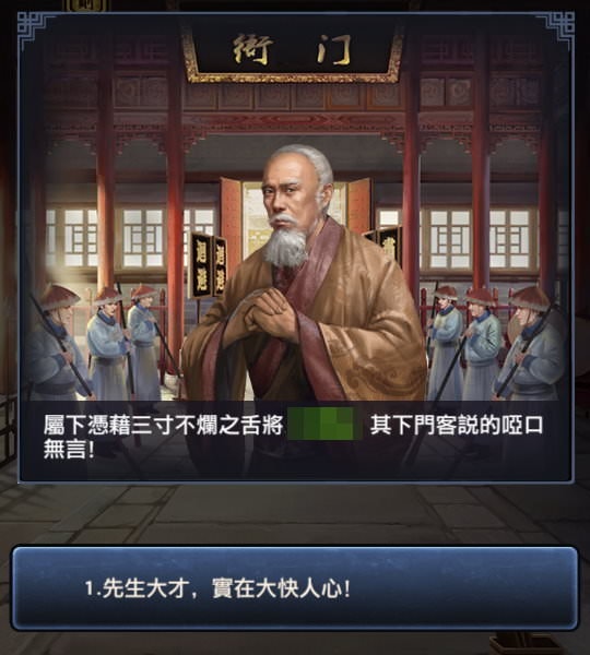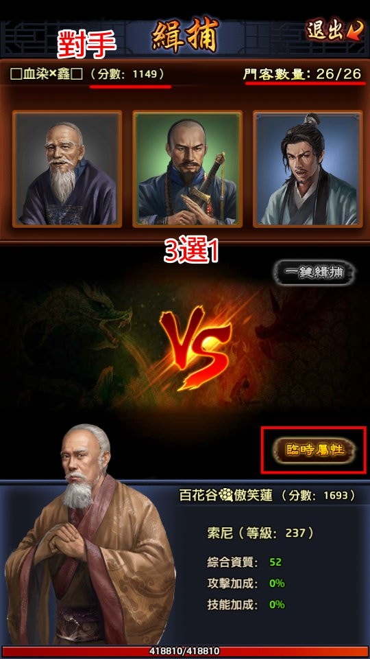 衙門界面,能看到對手的「衙門分數」與「門客數量」,會隨機出現3個對手旗下的門客,你得挑一個來打,打完後又隨機出現3個,直到你的門客被打敗,或是把對手所有門客都擊敗為止。