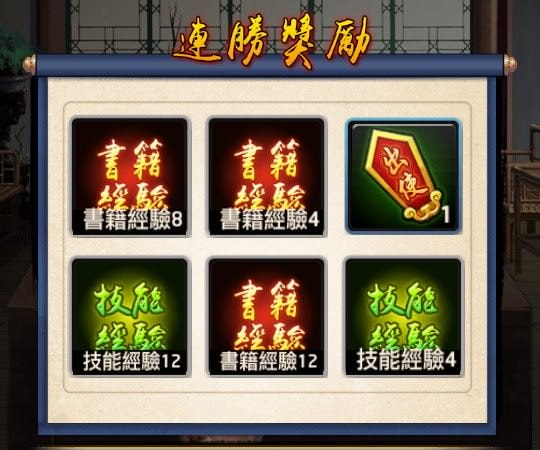 每3連勝,就有「連勝獎勵」,6個抽1個,獎勵有:書籍經驗4、書籍經驗8、書籍經驗12、技能經驗4、技能經驗8、技能經驗12、出使令。