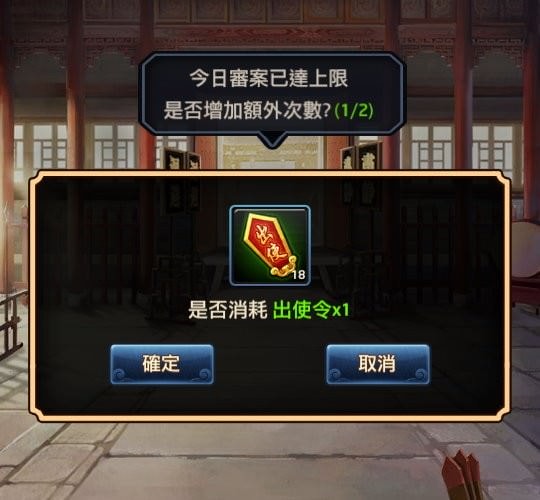 除了每日出戰4次+額外次數外,若還想多打幾場衙門,就得使用挑戰書或追捕令:《叫我官老爺》衙門:挑戰書、追捕令