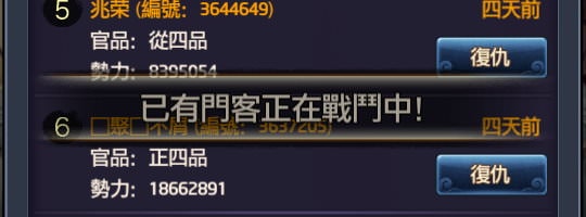 此外還要注意到「復仇」在服內有一週的期限,如果服內沒有「不互相使用挑戰書」的共識,你在平日打對方衙門,對方故意等到「衙門衝榜」(衙門衝榜、聯盟衙門衝榜)時才復仇,你衙門衝榜成績會很慘。