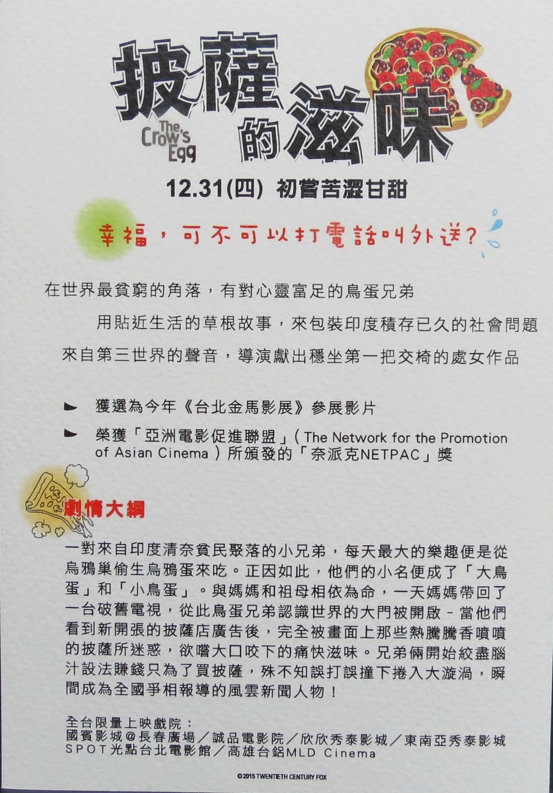 南印大城的貧民窟中,一對跟母親和阿嬤一起生活的小兄弟,因為喜歡偷烏鴉的蛋吃而自稱「大小烏鴉蛋」,兄弟倆平時靠撿鐵軌上掉落的煤塊貼補家用。某日鎮上新開了一家披薩店,兩人初次看到鋪滿起司跟餡料的披薩驚為天人,能咬上一口熱騰騰的披薩自此成為他們的美夢,於是兄弟倆努力打工賺錢要買披薩,沒想到展開了一連串意料之外的城市大冒險。