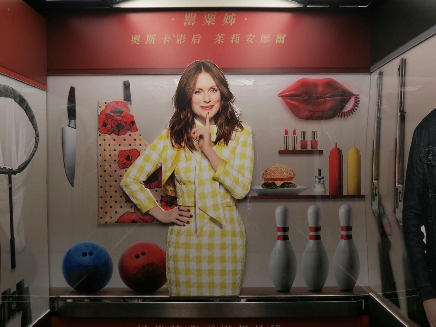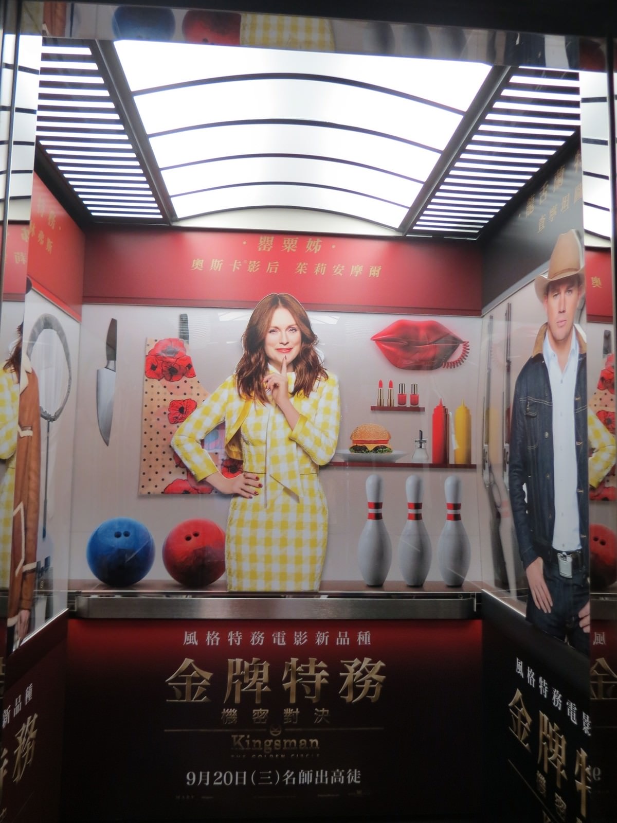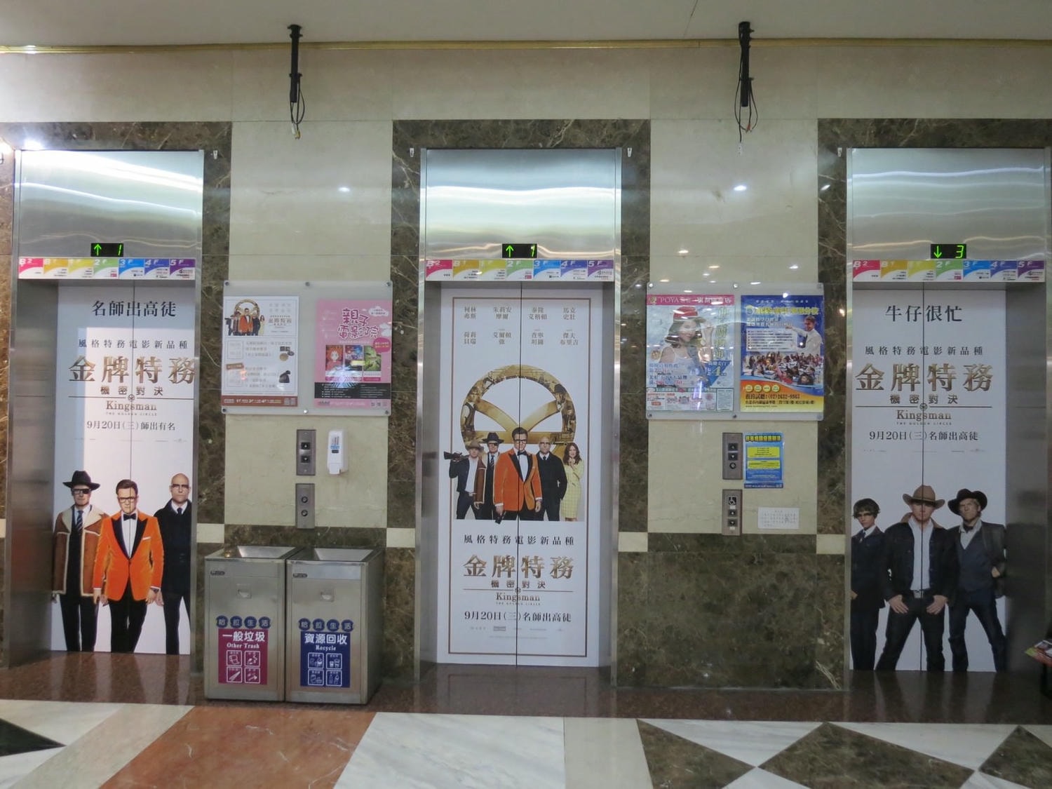 欣欣秀泰3個電梯,進去後3面都是特務與配備的廣告看板,很有意思,不過電梯內空間狹小不太好拍。
