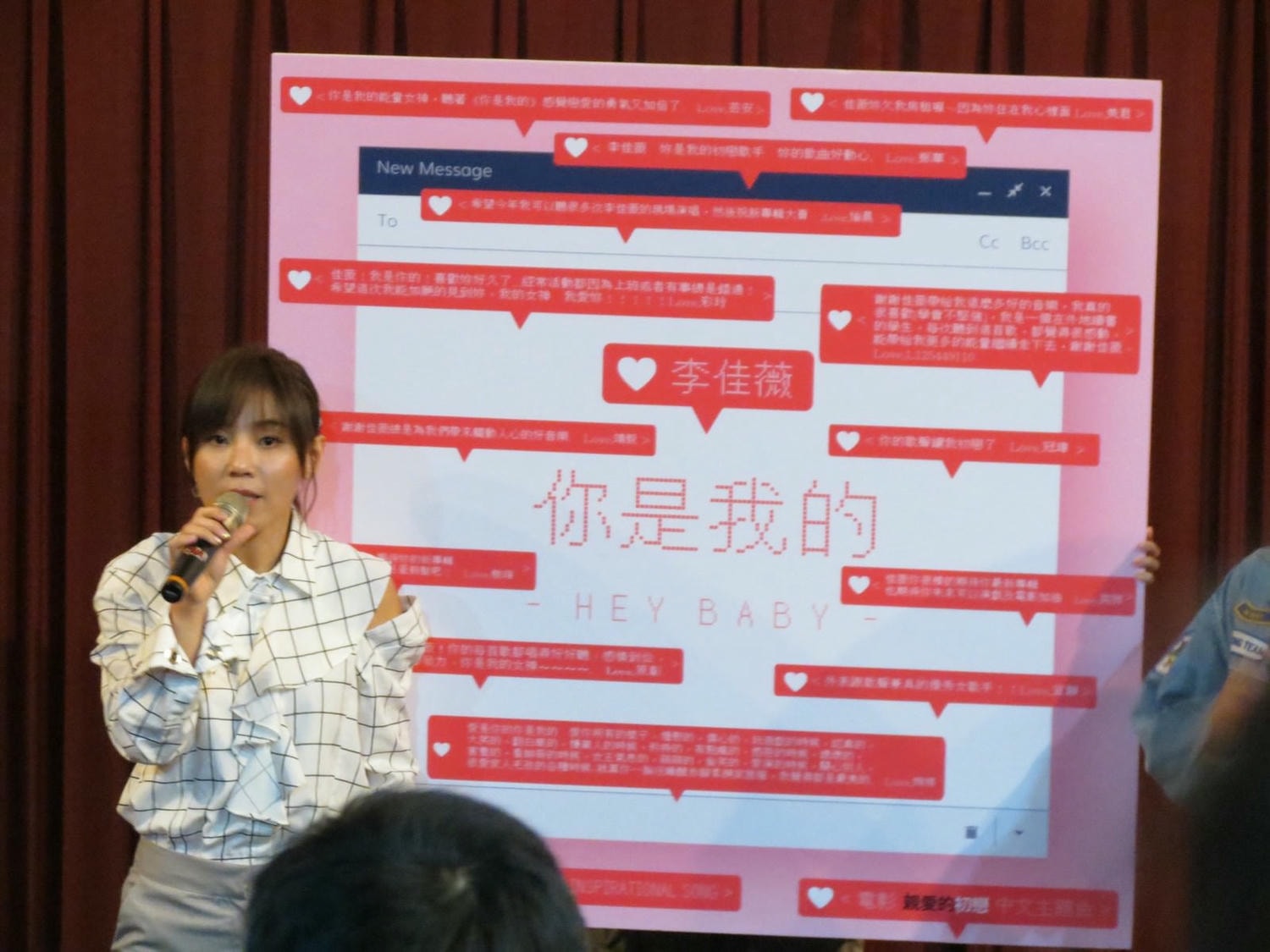 特映會現場,李佳薇清唱新歌《Hey Baby 你是我的》,這首歌同時也是《親愛的初戀》中文主題曲。