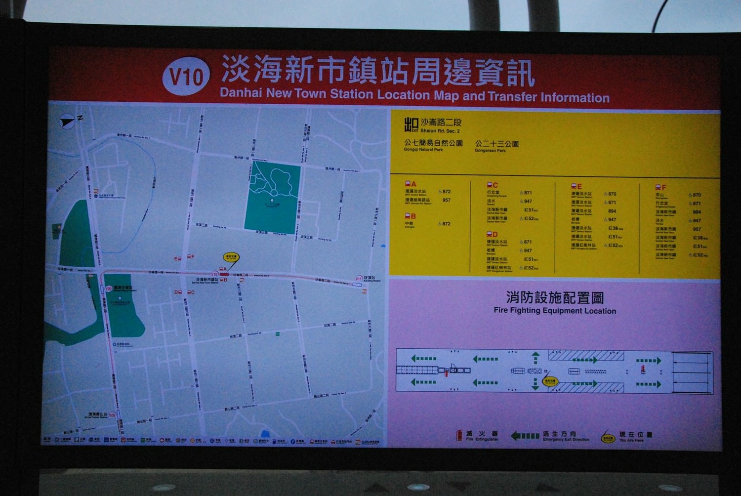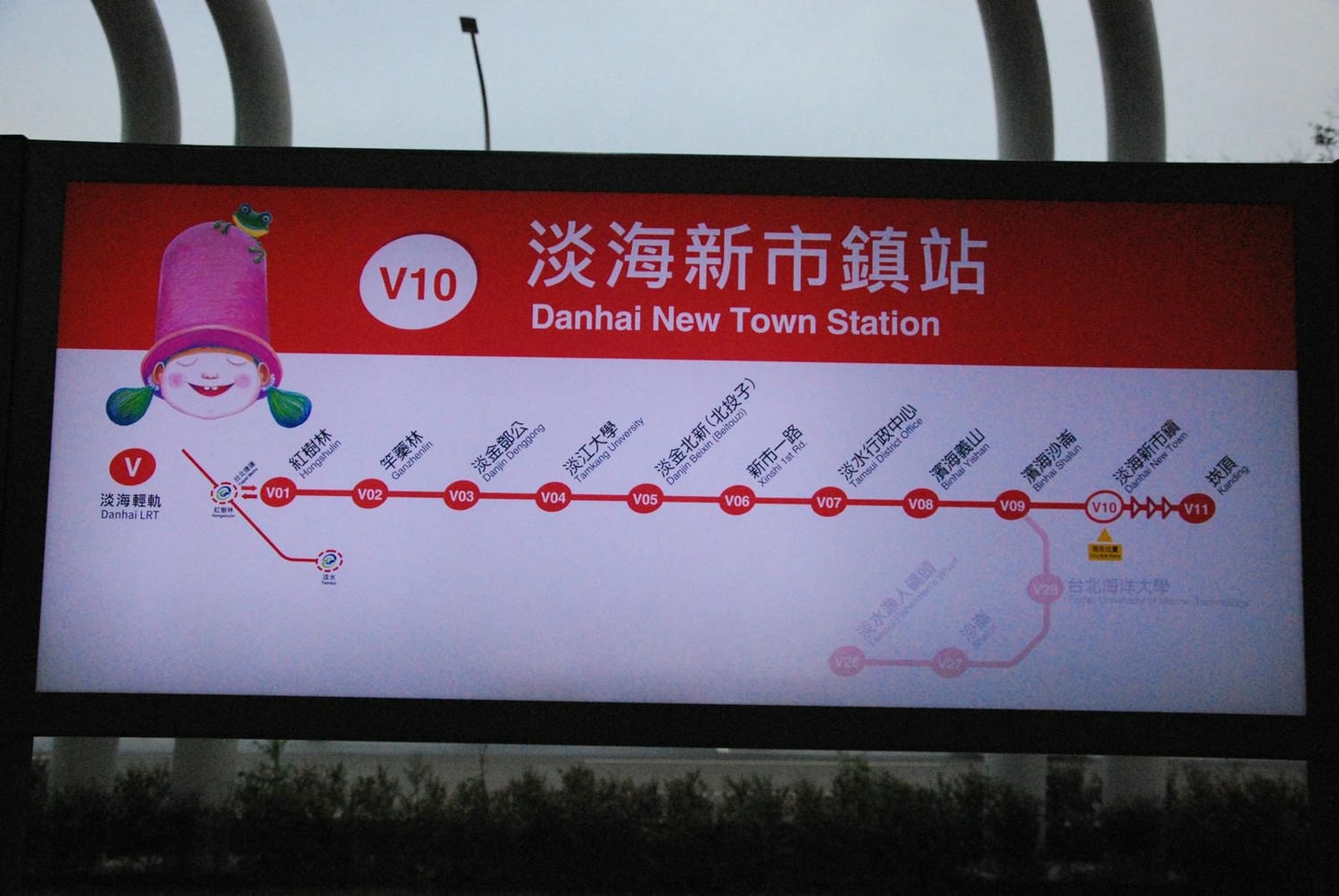 | 綠山線 | 紅樹林(V01)| 竿蓁林(V02)| 淡金鄧公(V03)| 淡江大學(V04)| 淡金北新(北投子)(V05)| 新市一路(V06)| 淡水行政中心(V07)| 濱海義山(V08)| 濱海沙崙(V09)| 淡海新市鎮(V10)| 崁頂(V11) |