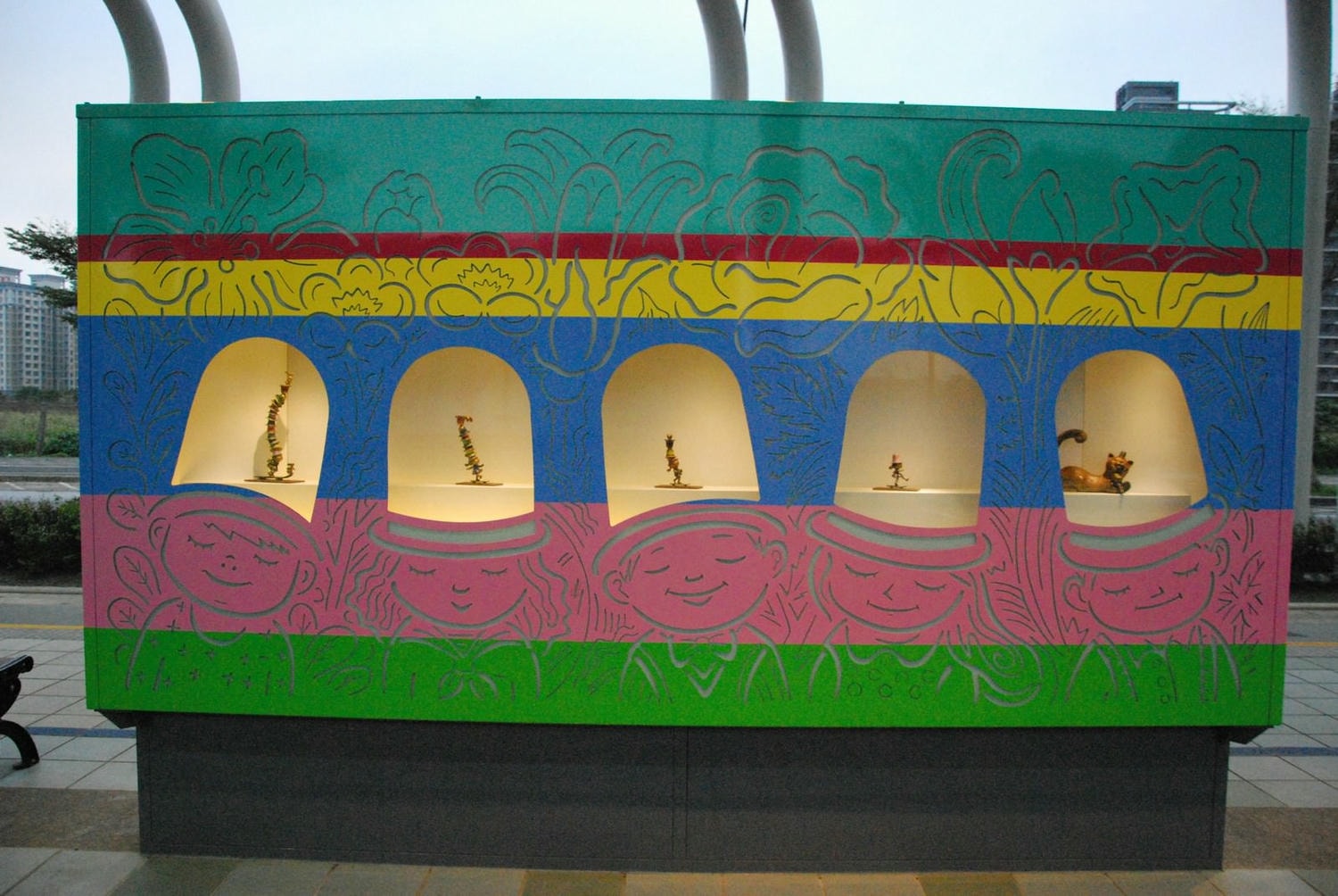 淡海新市鎮站的公共藝術是櫥窗,每個櫥窗都是帽子造型,裡頭有各站縮小版的公共藝術。