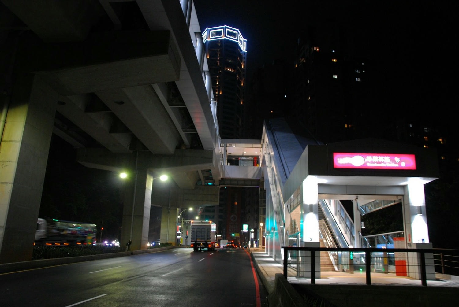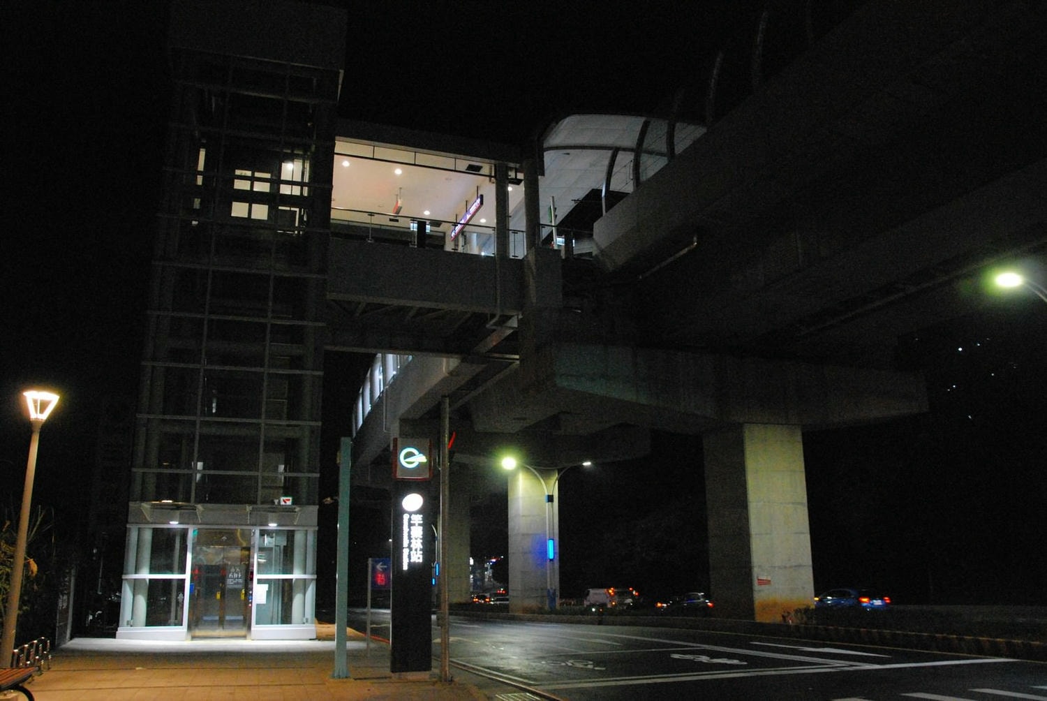 車站主體,行駛在淡金路上電梯側的視角(夜晚)。