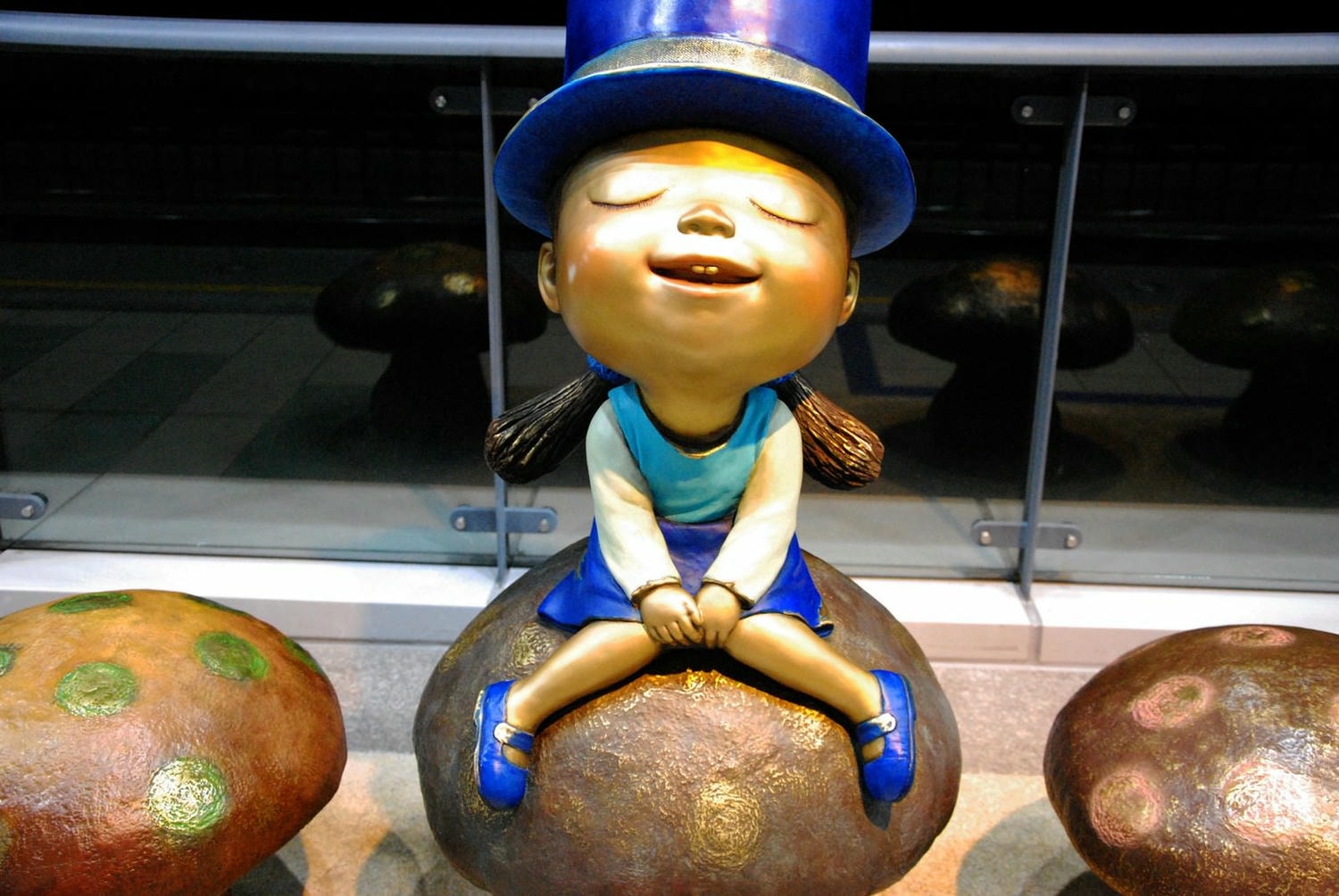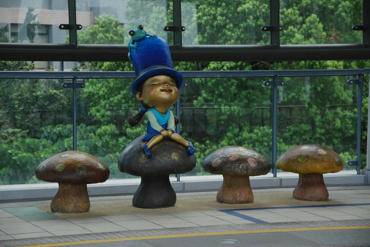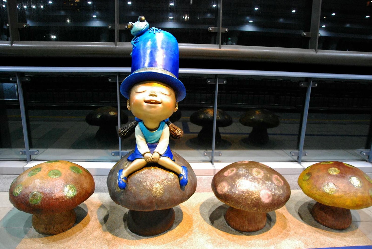 淡江大學站有2組公共藝術,第一組是戴著上頭停著一隻青蛙的深藍色帽子的小女孩坐在蘑菇上。