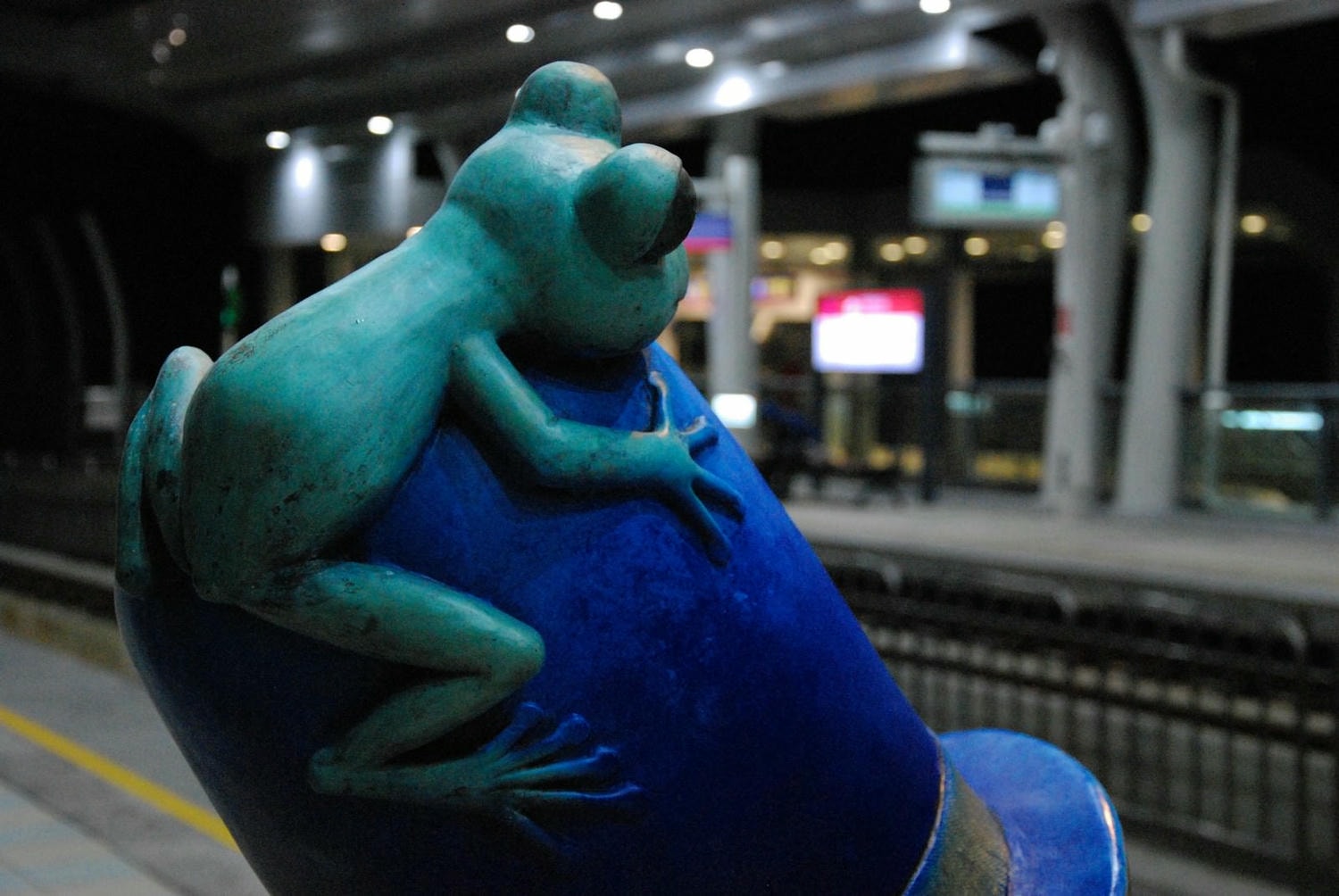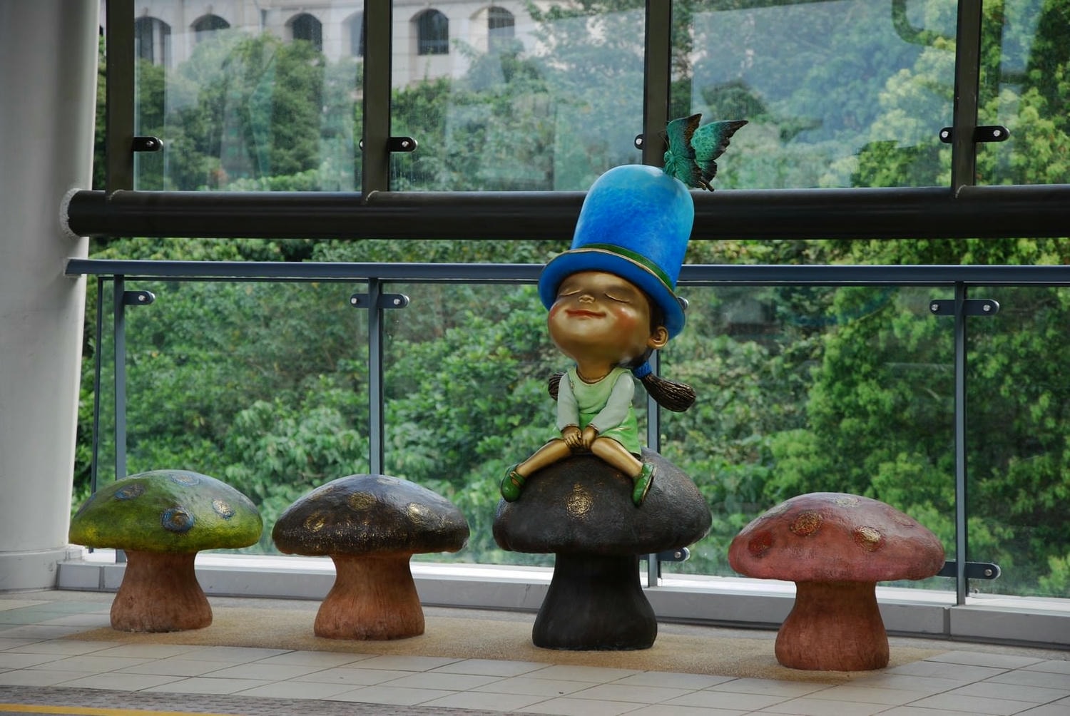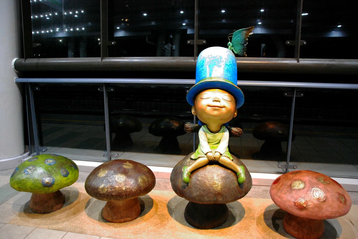 淡江大學站有2組公共藝術,第一組是戴著上頭停著一隻青蛙的深藍色帽子的小女孩坐在蘑菇上。