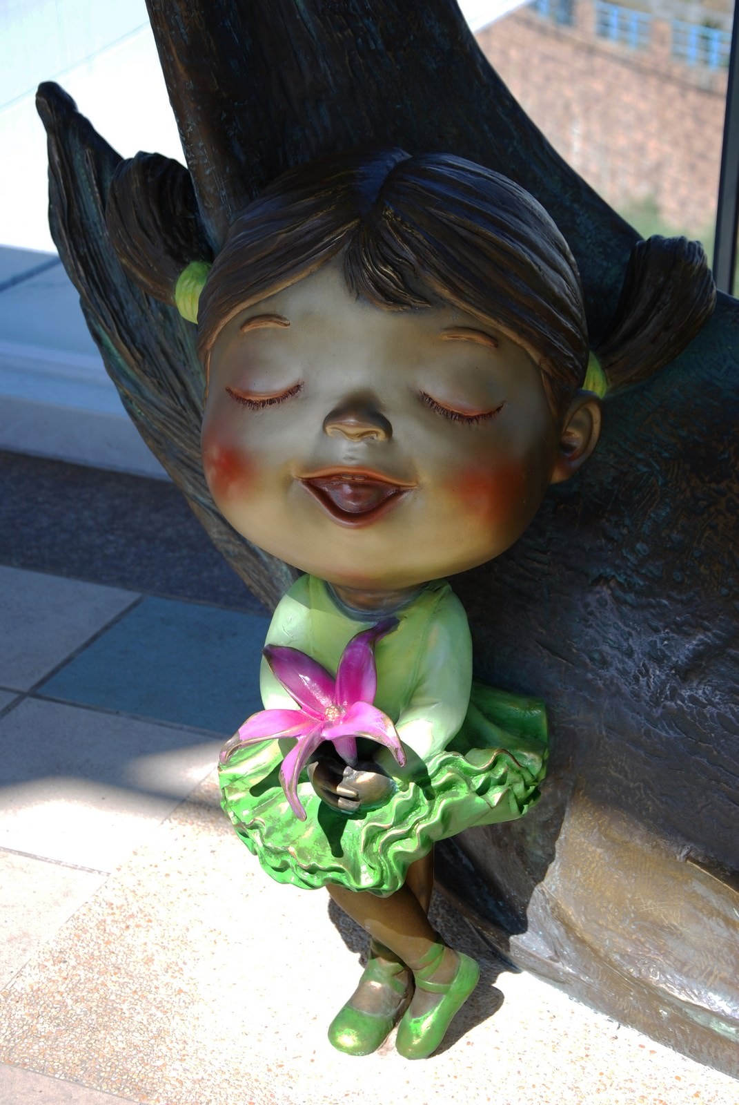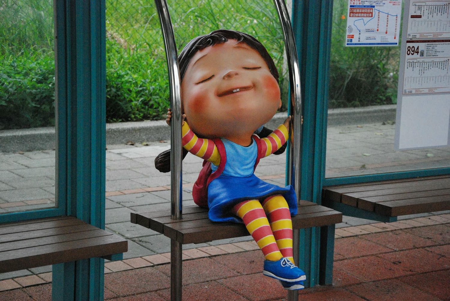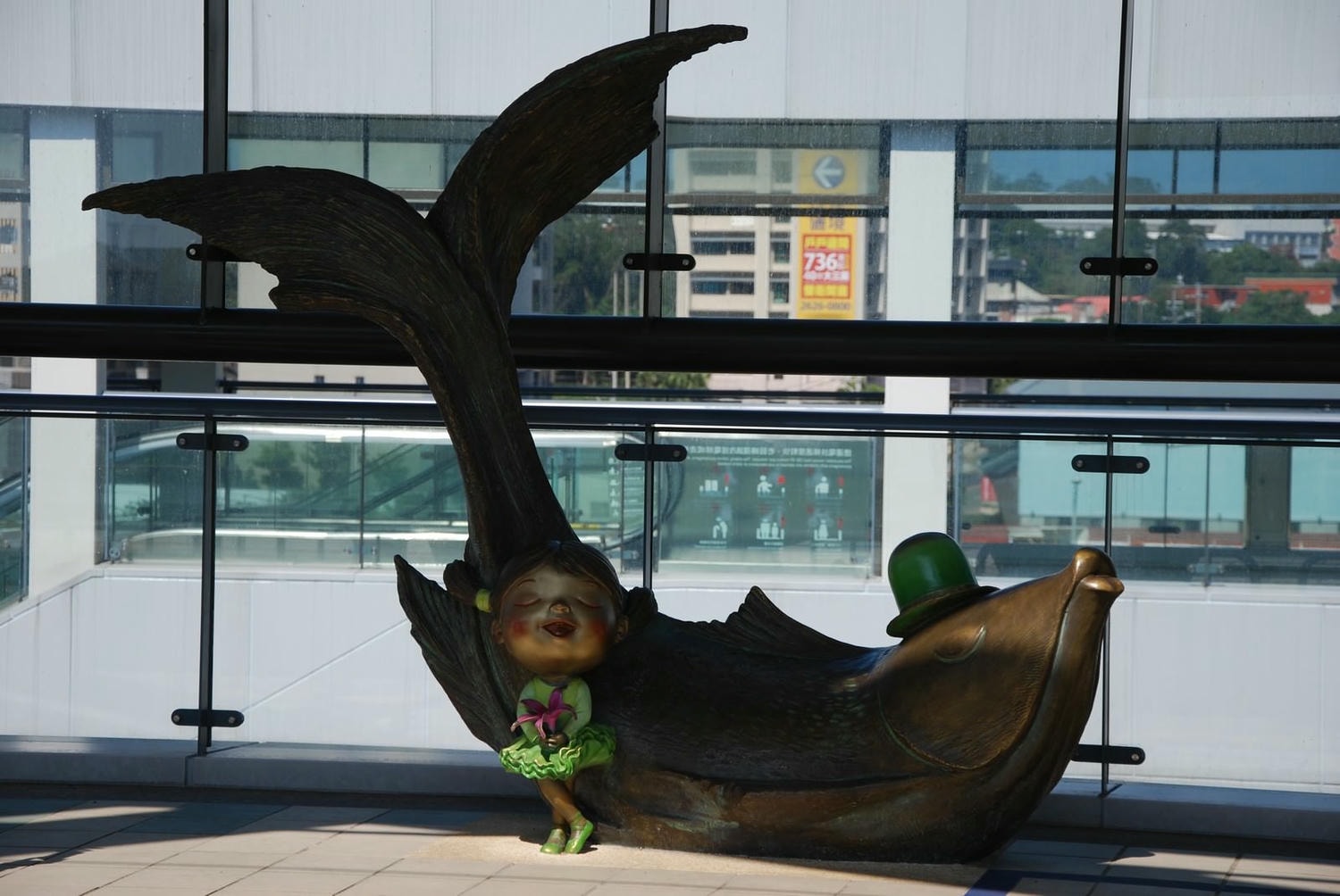 淡水行政中心站的公共藝術是穿著綠色芭蕾舞裙、手上拿著紫色百合花的小女孩,倚靠在戴著綠色帽子的魚身上。