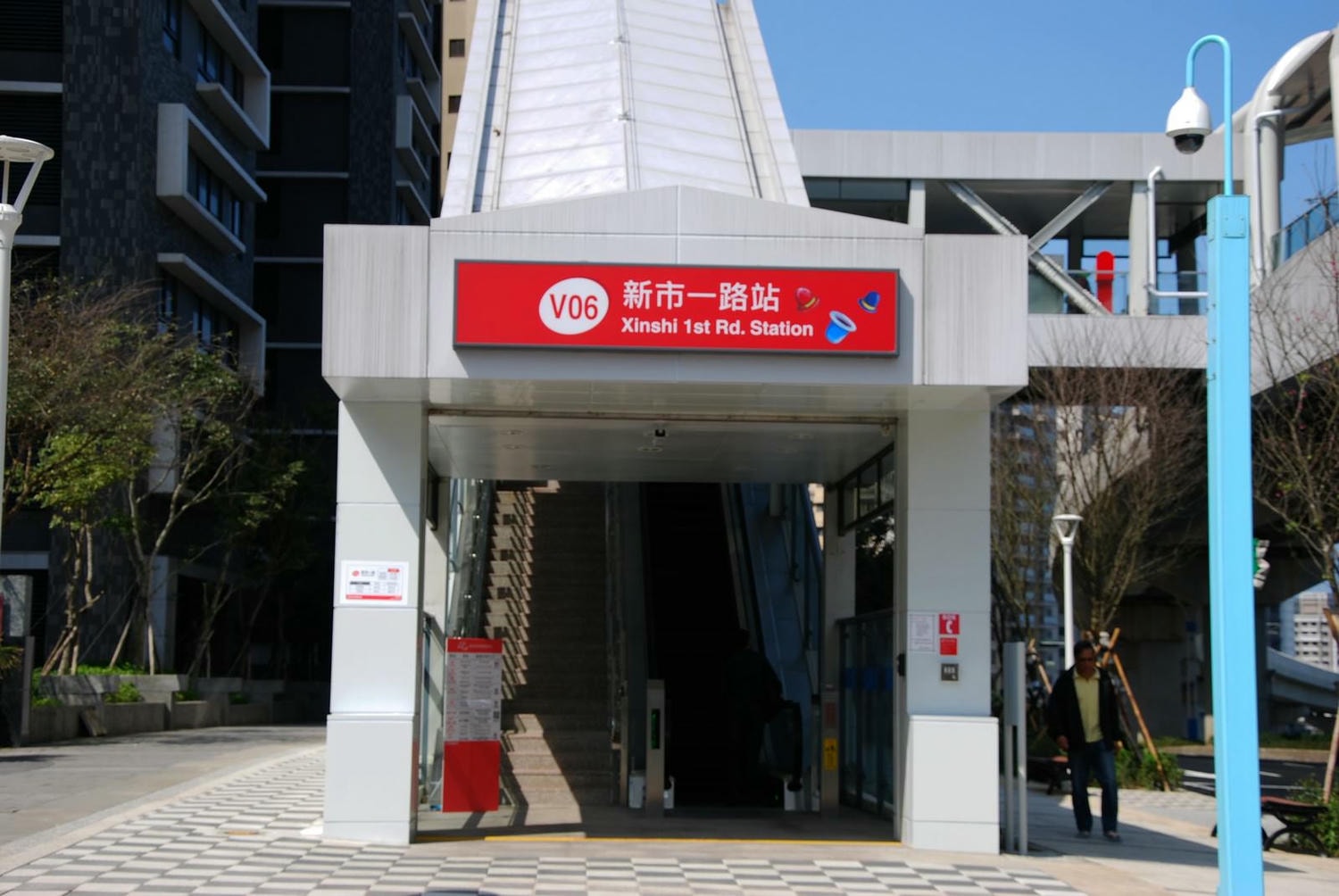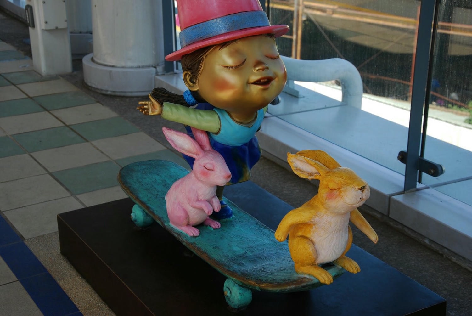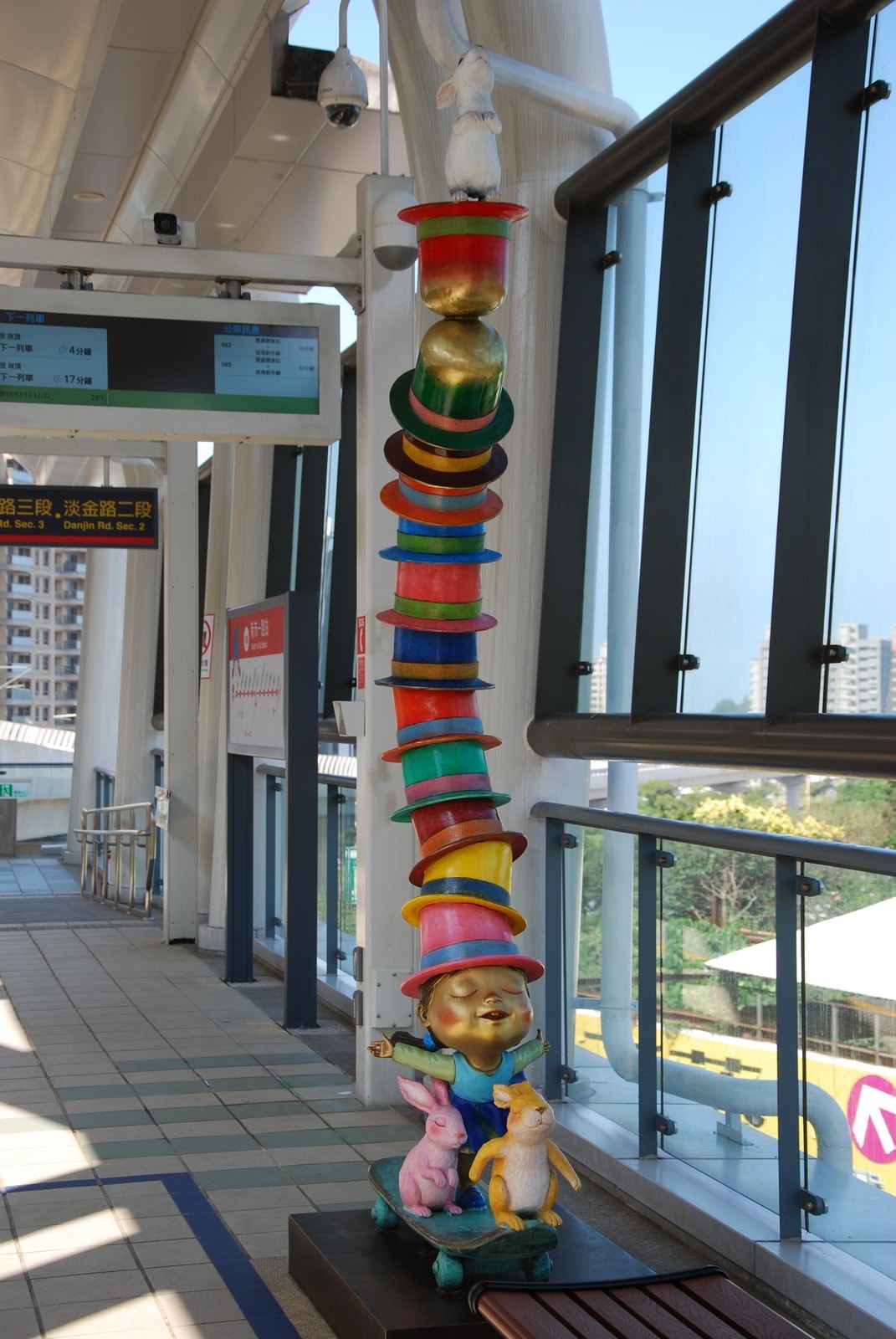 新市一路站的公共藝術是小女孩頭上戴著12頂帽子,跟著兩隻黃色與粉紅色的兔子一起溜滑板,還有一隻兔子從最上方的帽子跳了出來。