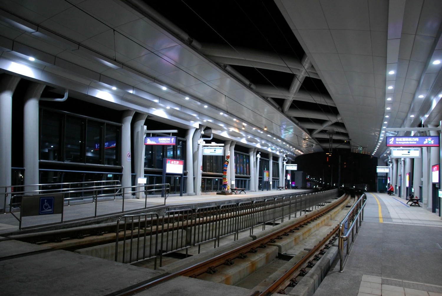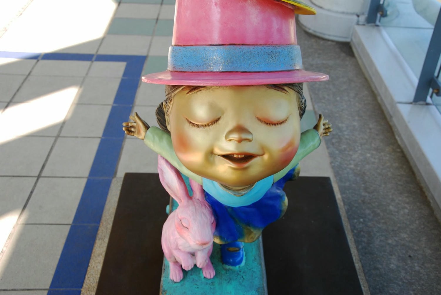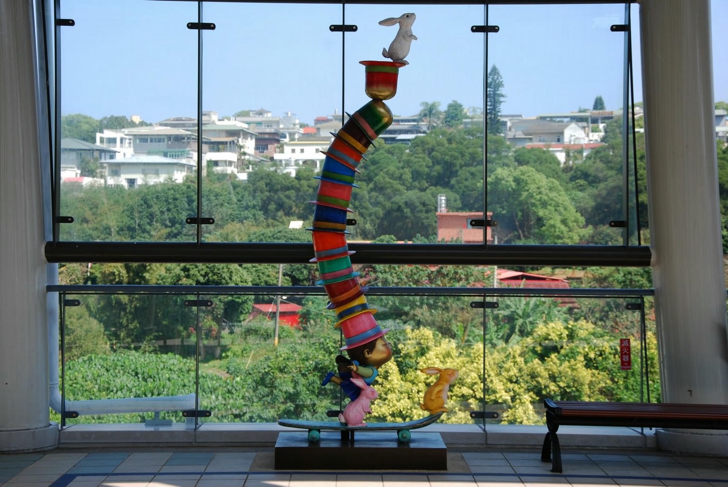 新市一路站的公共藝術是小女孩頭上戴著12頂帽子,跟著兩隻黃色與粉紅色的兔子一起溜滑板,還有一隻兔子從最上方的帽子跳了出來。