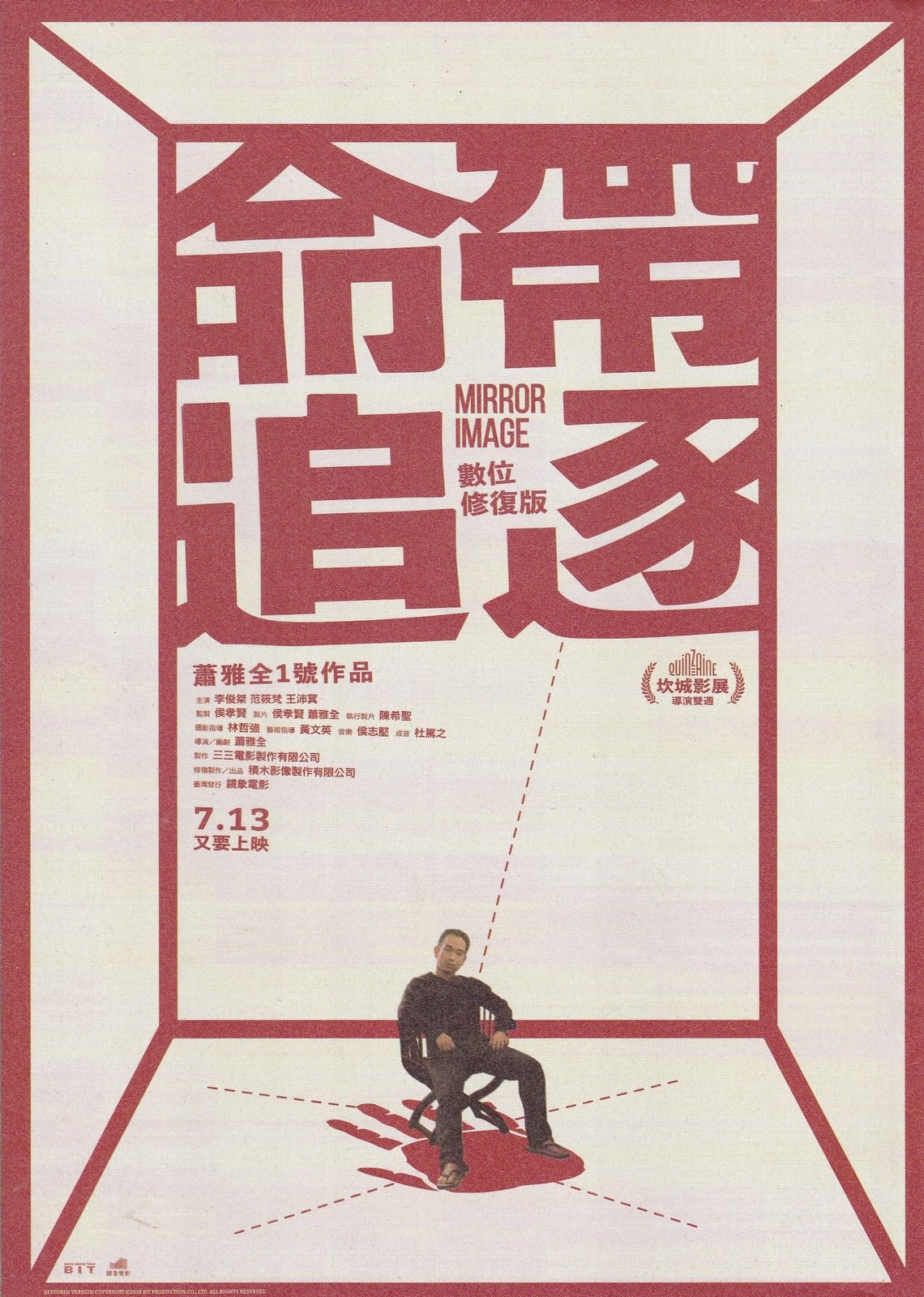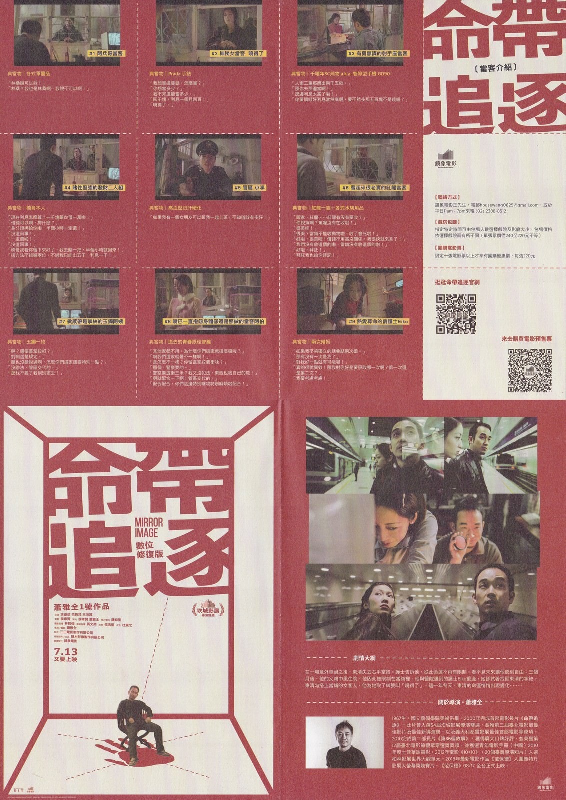《命帶追逐》演職員表‧發行‧宣傳‧海報2002-11-15宣傳發行 Table of Contents Toggle 電影資訊(說明)電影宣傳(說明)電影海報電影文宣 電影資訊(說明) 電影名稱:命帶追逐 其他名稱:Mirror Image(英文) 年份:2002年 國家:台灣 語言:華語 台灣發行:三視影業/三視多媒體網路股份有限公司(2002年)、三三電影/三三電影製作有限公司(2018年數位修復) 台灣上映:2002/11/15、2018/07/13[數位修復] 電影宣傳(說明) 電影海報 台灣(製片國家) 電影文宣 電影DM,打開後一面應該是2002年時的海報,另一面是角色介紹。 相關文章:影評 | 宣傳 標籤# Mirror Image# 三三電影# 三視影業# 台灣上映電影# 台灣電影# 命帶追逐# 演職員表# 電影DM# 電影宣傳# 電影文宣# 電影海報 上一 文章 021031 甘肅劉家峽再度發現新恐龍足印化石 下一 文章 011122 大陸科學家發現一種滅絕動物大類