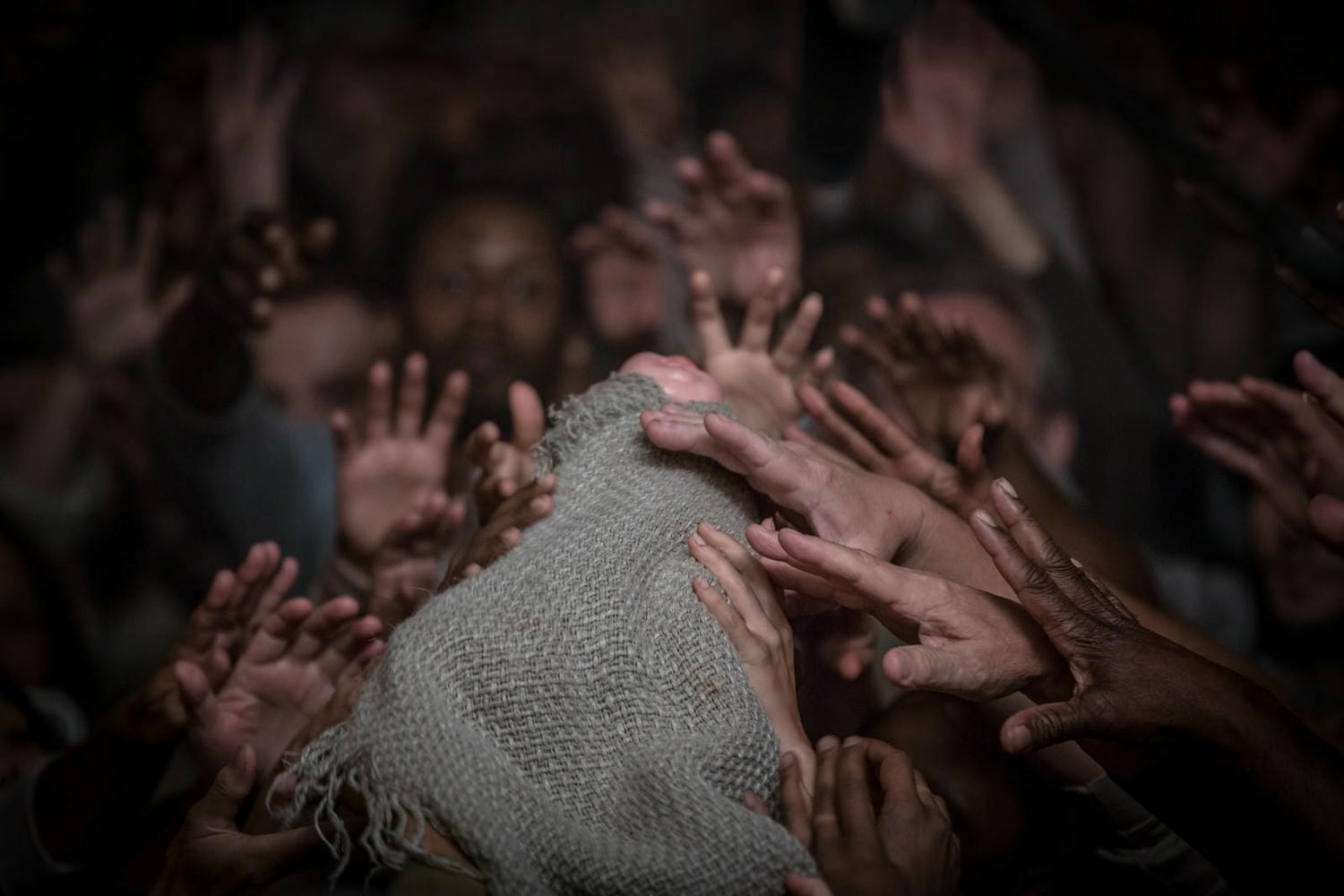 6, 母親生小孩這邊很明顯就是聖母瑪利亞與聖嬰耶穌,是整部電影中最明顯的。眾人分食他也呼應耶穌說:吃我肉、喝我血的人就有永生,在末日我要叫他復活。