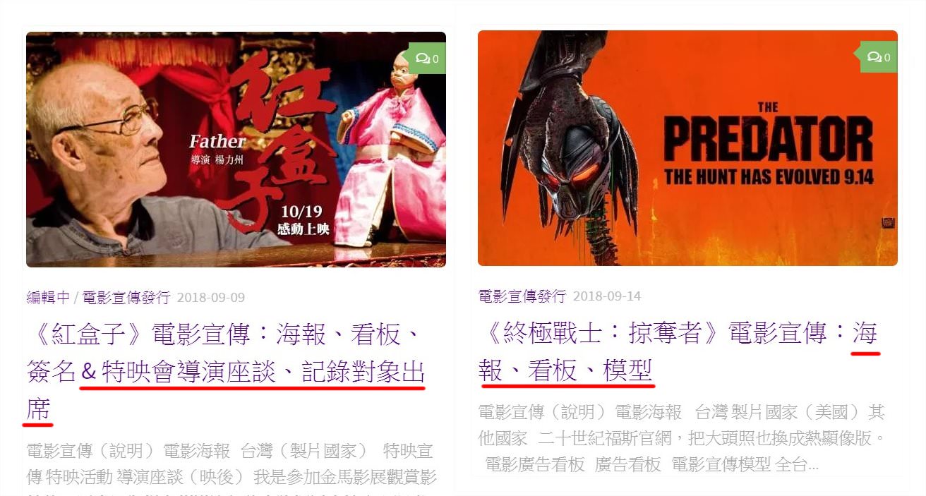 在標題上我會盡量讓讀者一目瞭然文章內容,較基本的如電影海報、廣告看板幾乎每部電影都會有,如果有較特別的也會標上,另外用 & 符號作為區分,後方會列出特映會較特別的活動,如導演、演員出席。