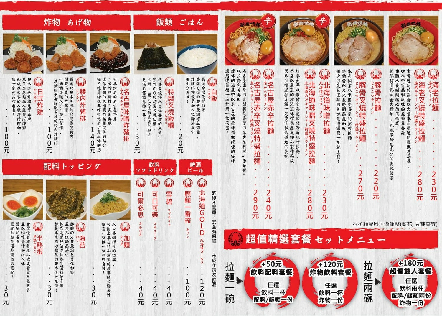 | 店家推薦:拉麵(豚骨、海老、北海道味噌)、味噌炸豬排 |