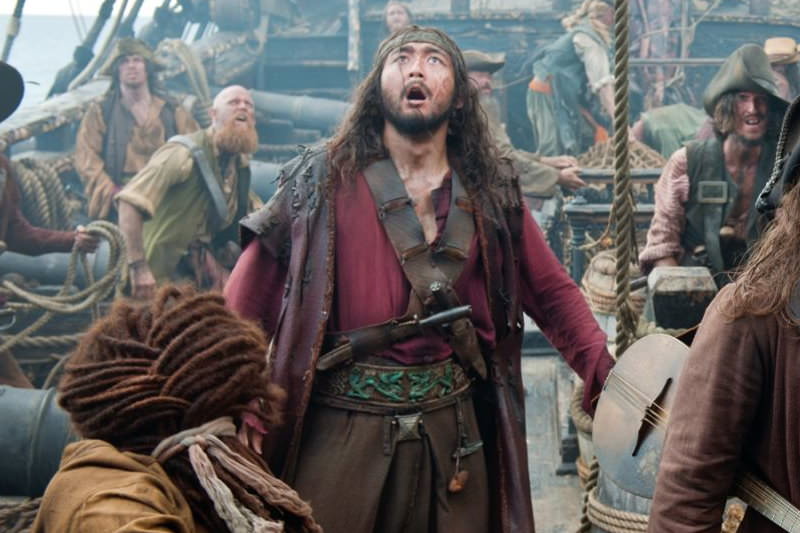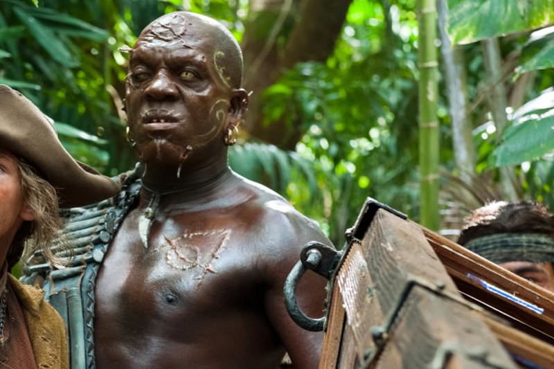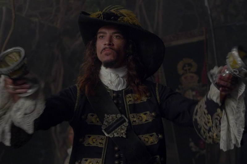 第三集偷偷開走黑珍珠號,這集則口頭交代在那之後他遇到黑鬍子襲擊,被其操控的繩子綁著,自行切斷腿才順利逃生,所以要來找黑鬍子報仇。