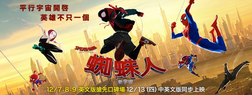 | 電影名稱 | Spider-Man: Into the Spider-Verse(美國, 2018年) / 蜘蛛人:新宇宙(台灣) / 蜘蛛侠:平行宇宙(中國) / 蜘蛛俠:跳入蜘蛛宇宙(香港) | |