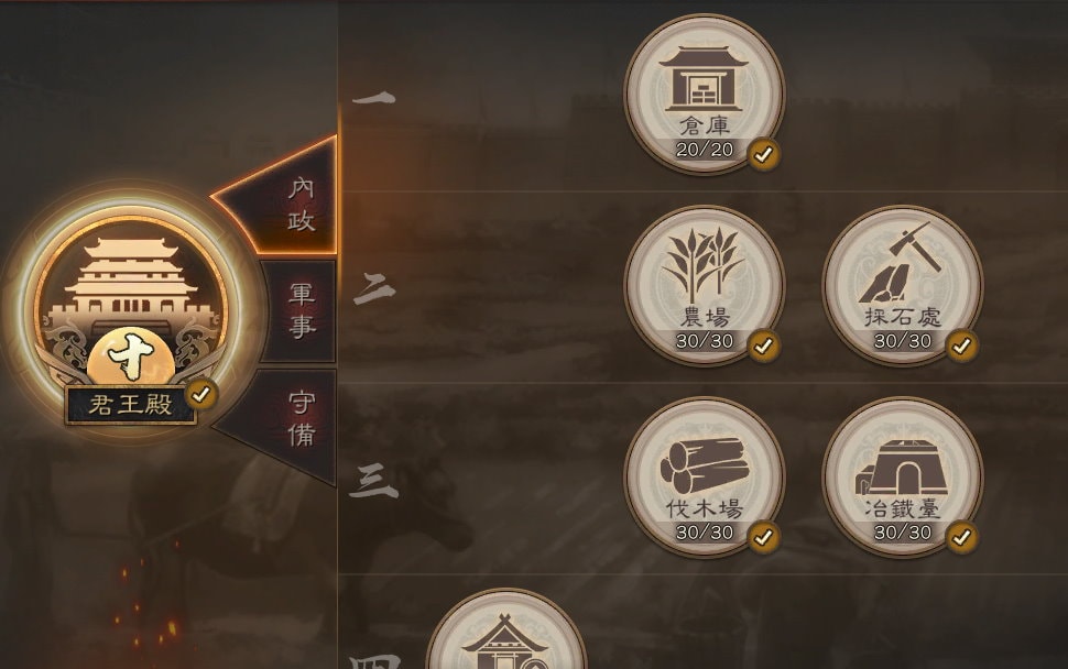 | 城建 | 內政 | 軍事 | 守備 | |