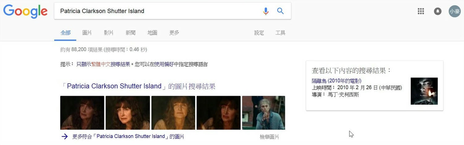 用「Shutter Island Patricia Clarkson」下去搜尋的確也會出現這張照片,但我後來去找 IMDb 確認,這張照片標記的演員是 Jill Larson,