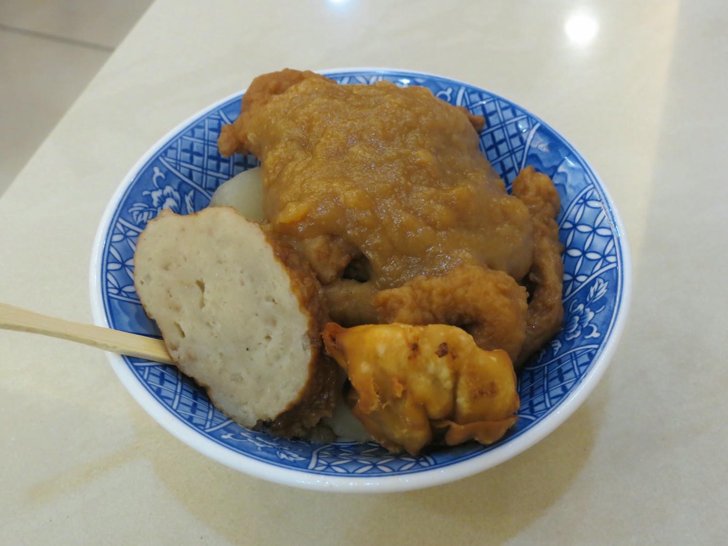 約有1塊炸餛飩酥、2塊油豆腐、3塊白蘿蔔、1塊片狀甜不辣、1條狀甜不辣、1竹輪切塊、2片甜不辣切片,價格來說個人是覺得不便宜,快要一個便當的價格。