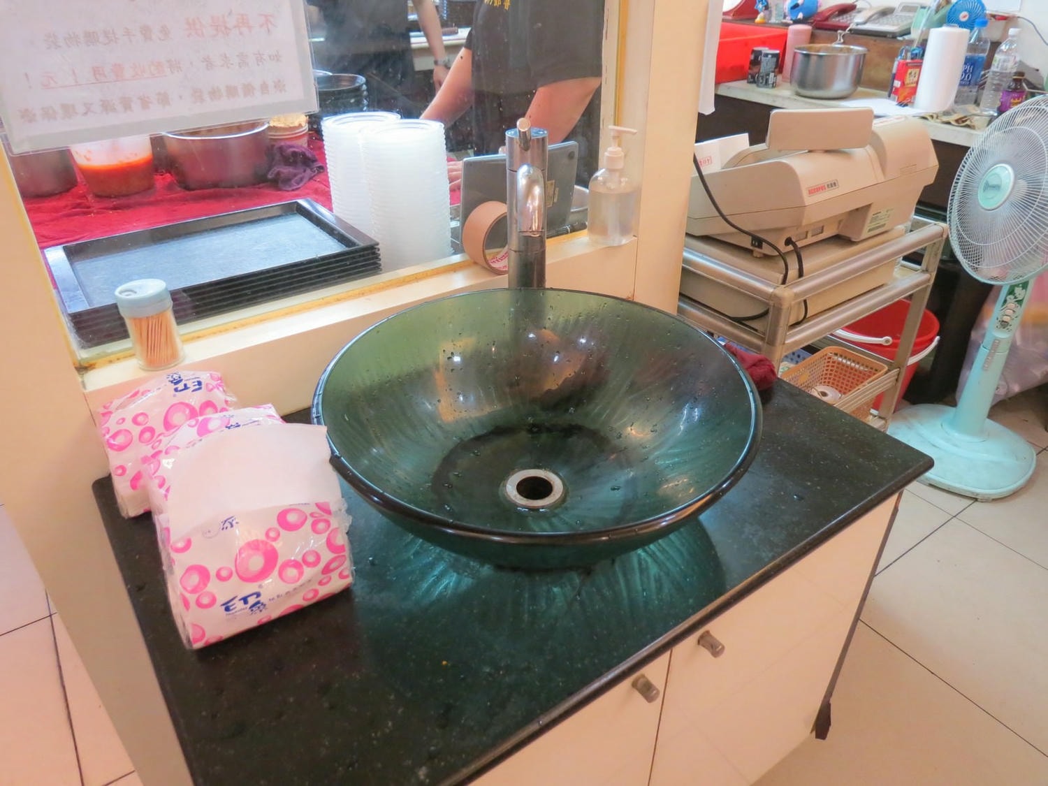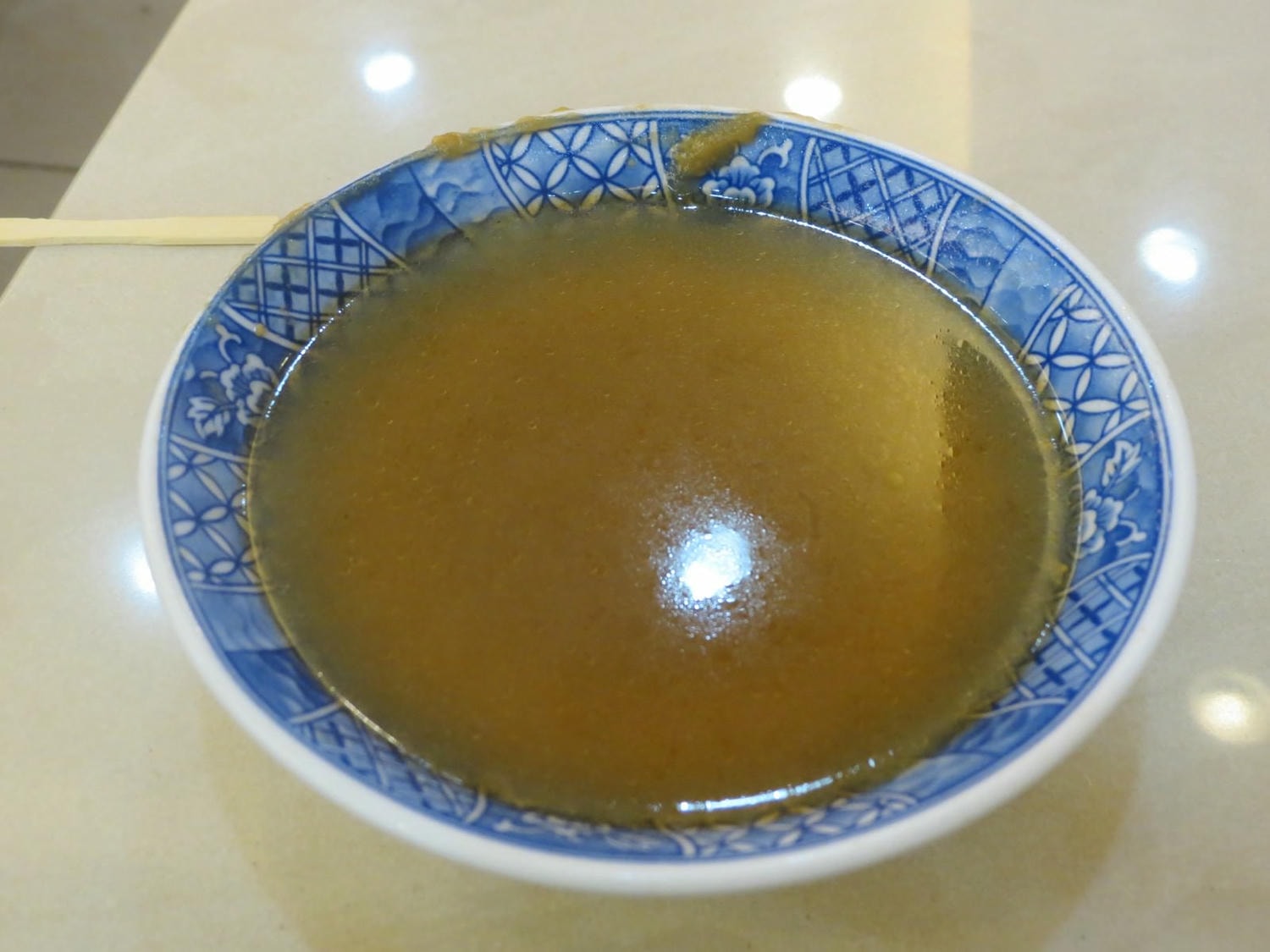 跟蠻多甜不辣店家是把甜不辣碗中盛滿湯頭,醬料另外用小碟子裝,這邊有點不同;店家從湯中撈出甜不辣後,會把湯濾掉,直接在碗內加醬料。