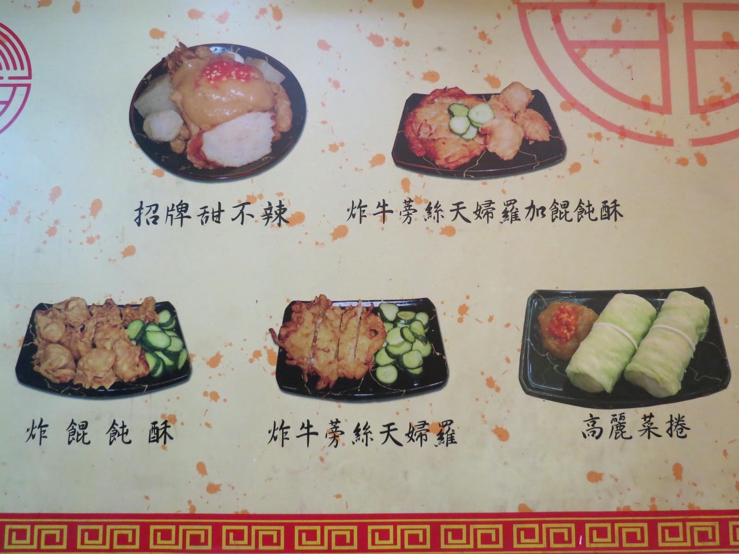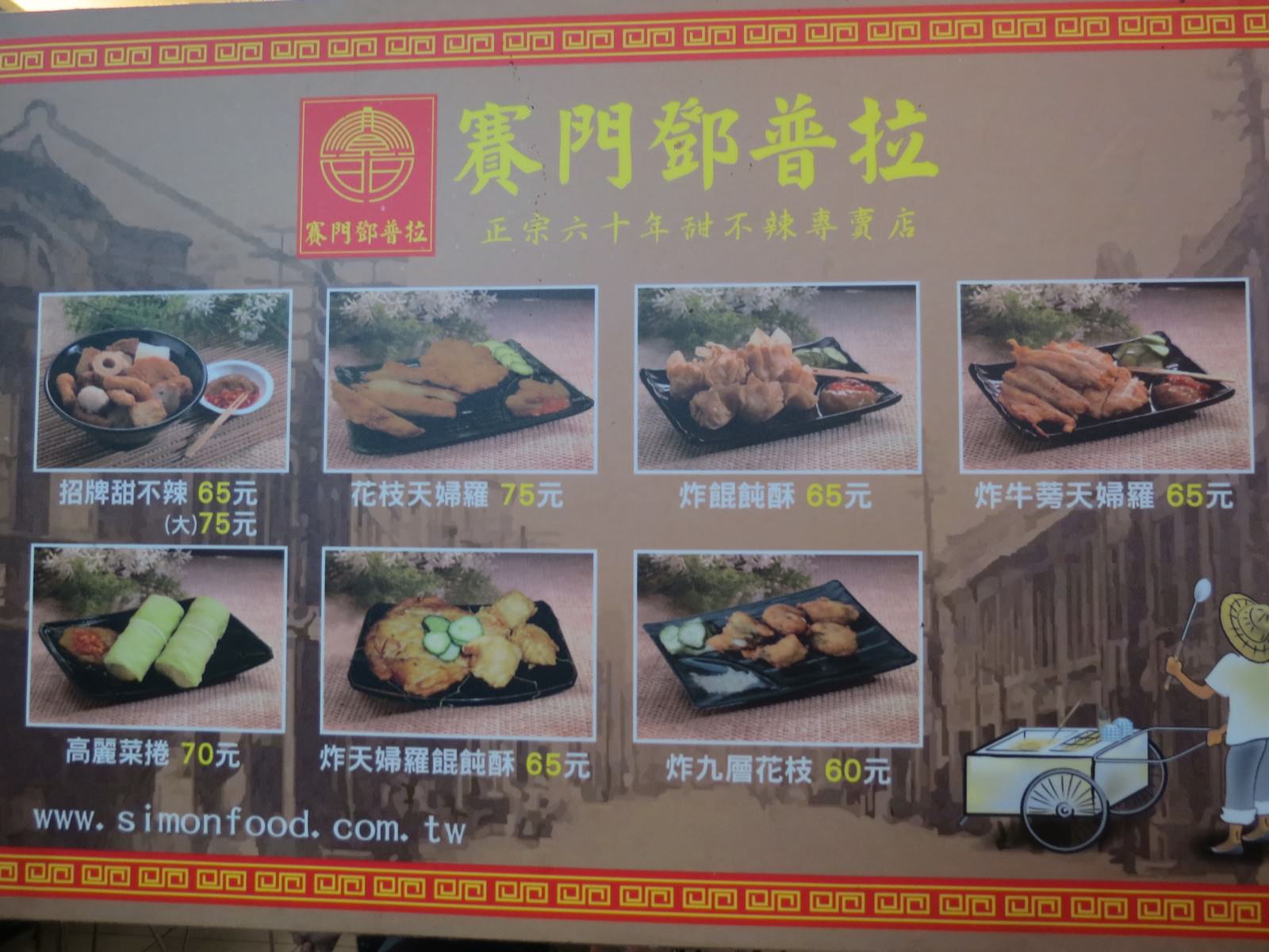 餐點品項,賽門鄧普拉招牌是甜不辣,但也有炸物、高麗菜捲等可以搭配。
