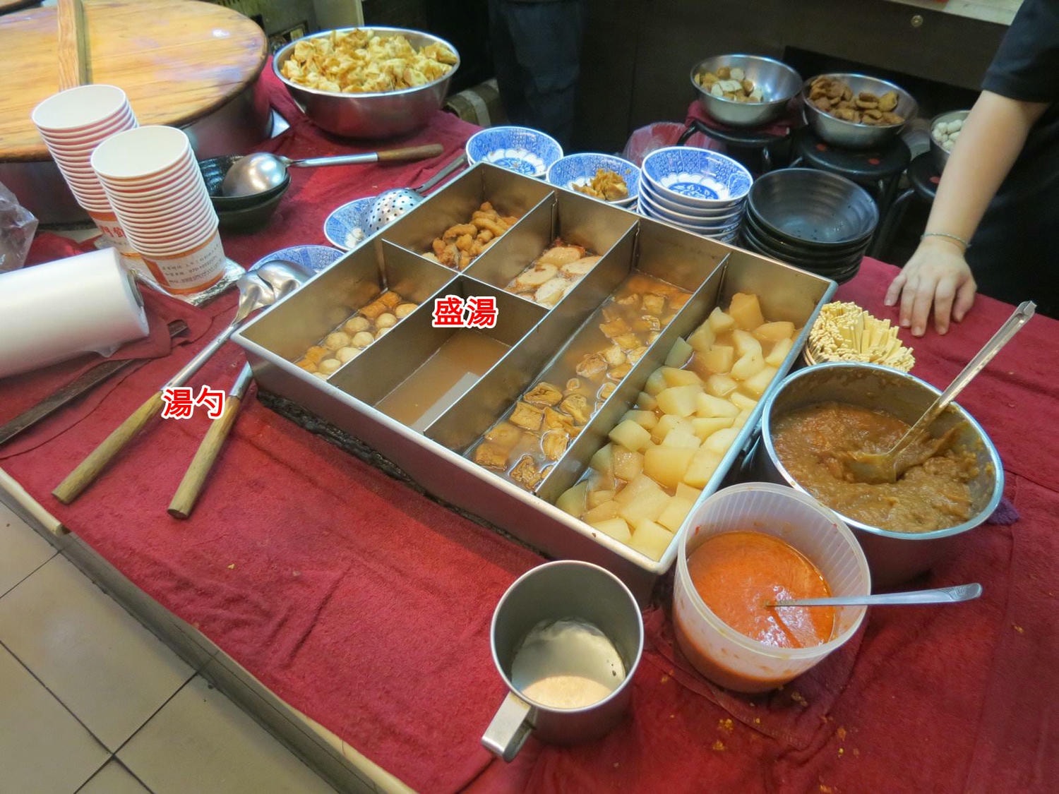 吃完甜不辣後,可自行來這免費裝盛湯來喝。左邊有提供湯勺,而中間那格沒有煮任何東西的就是裝湯的。(一開始就先加湯也是可以啦,但醬料就會溶入湯中)