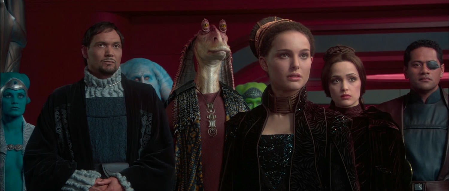 傑米史密茲/Jimmy Smits 飾演 Senator Bail Organa(圖左留鬍子男性),這角色在《俠盜一號》也有出現。