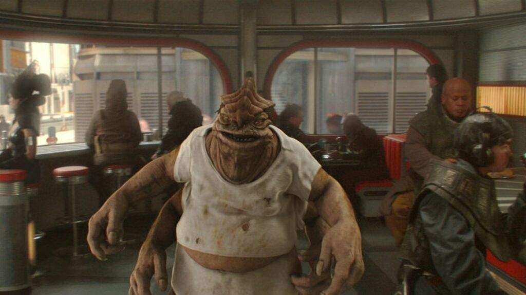 酒吧這段有個角色叫丹尼·法頓(Dannl Faytonni,圖中藍衣男子),就是由從原始三部曲就開始飾演 C-3PO 的演員安東尼丹尼斯客串的,這是他首次在星戰電影中露臉。