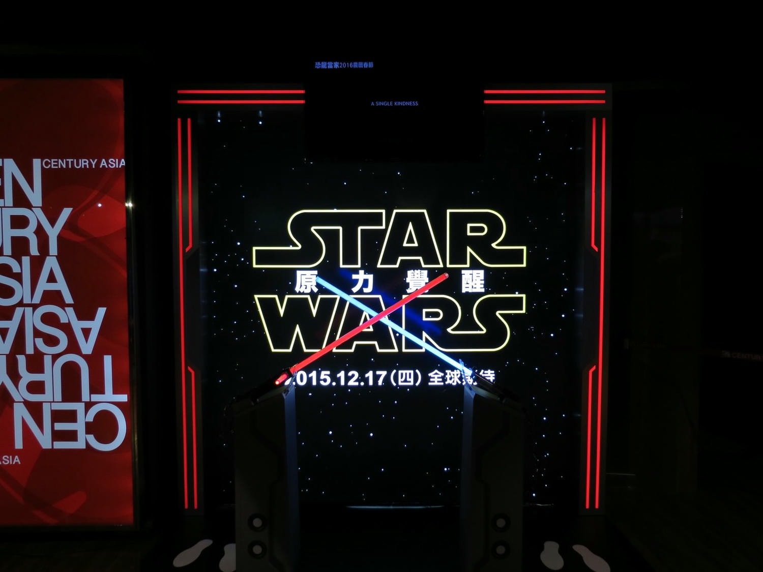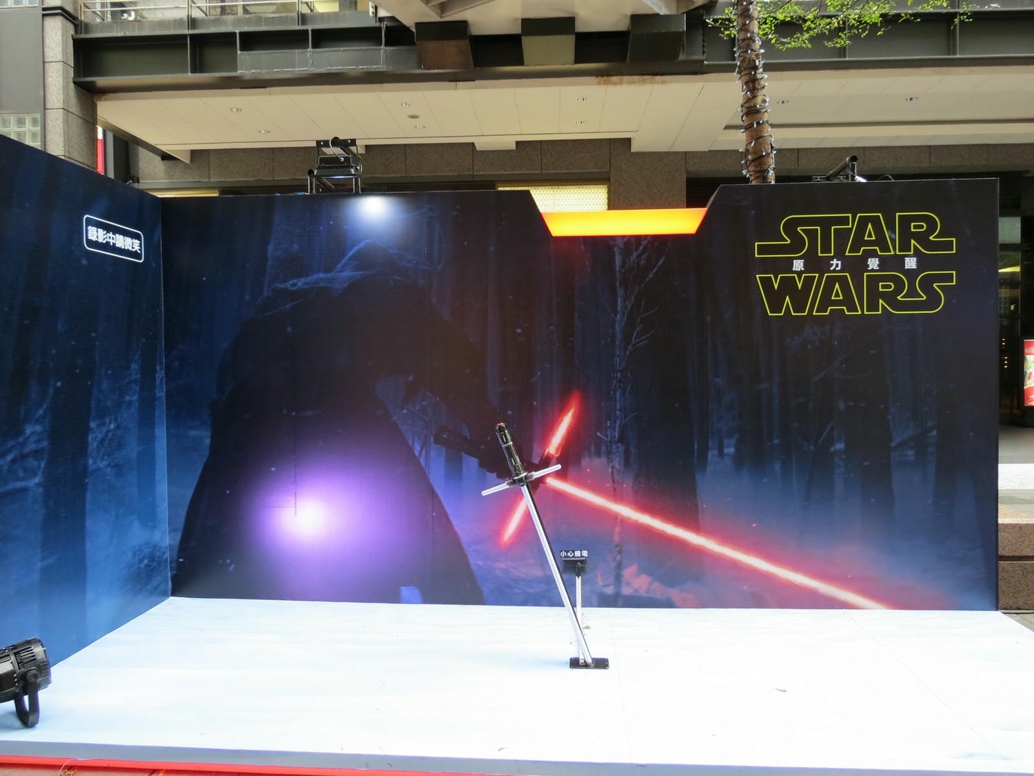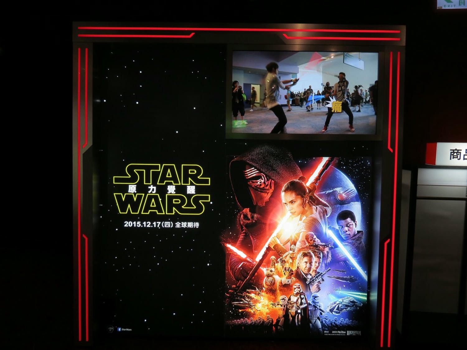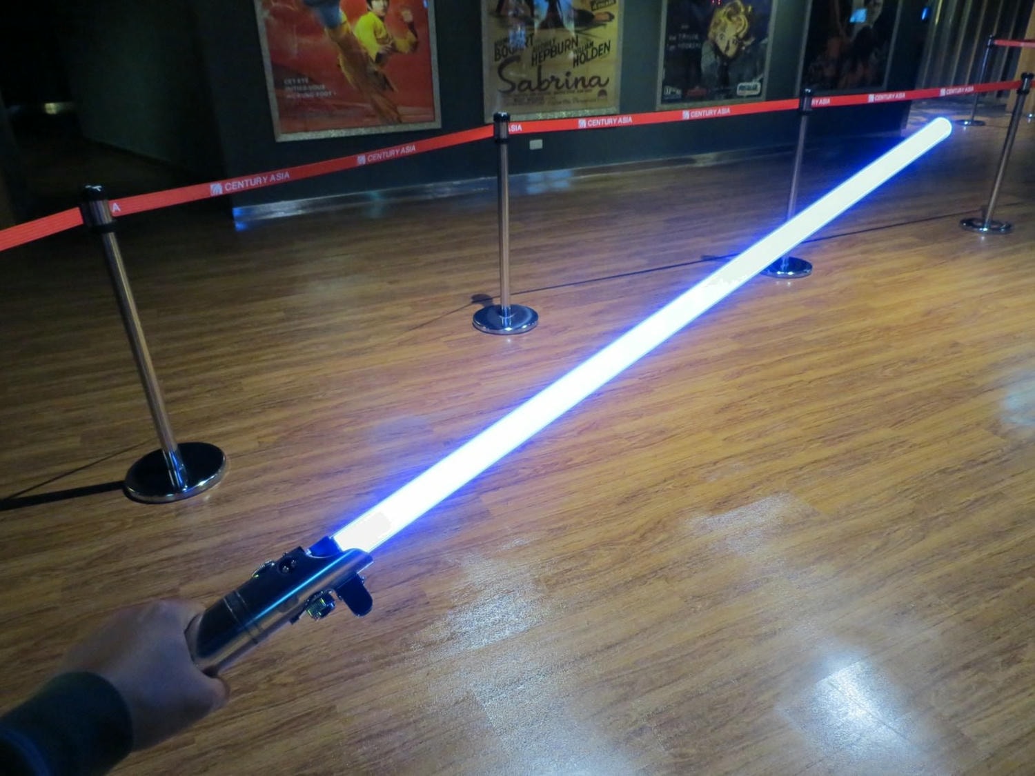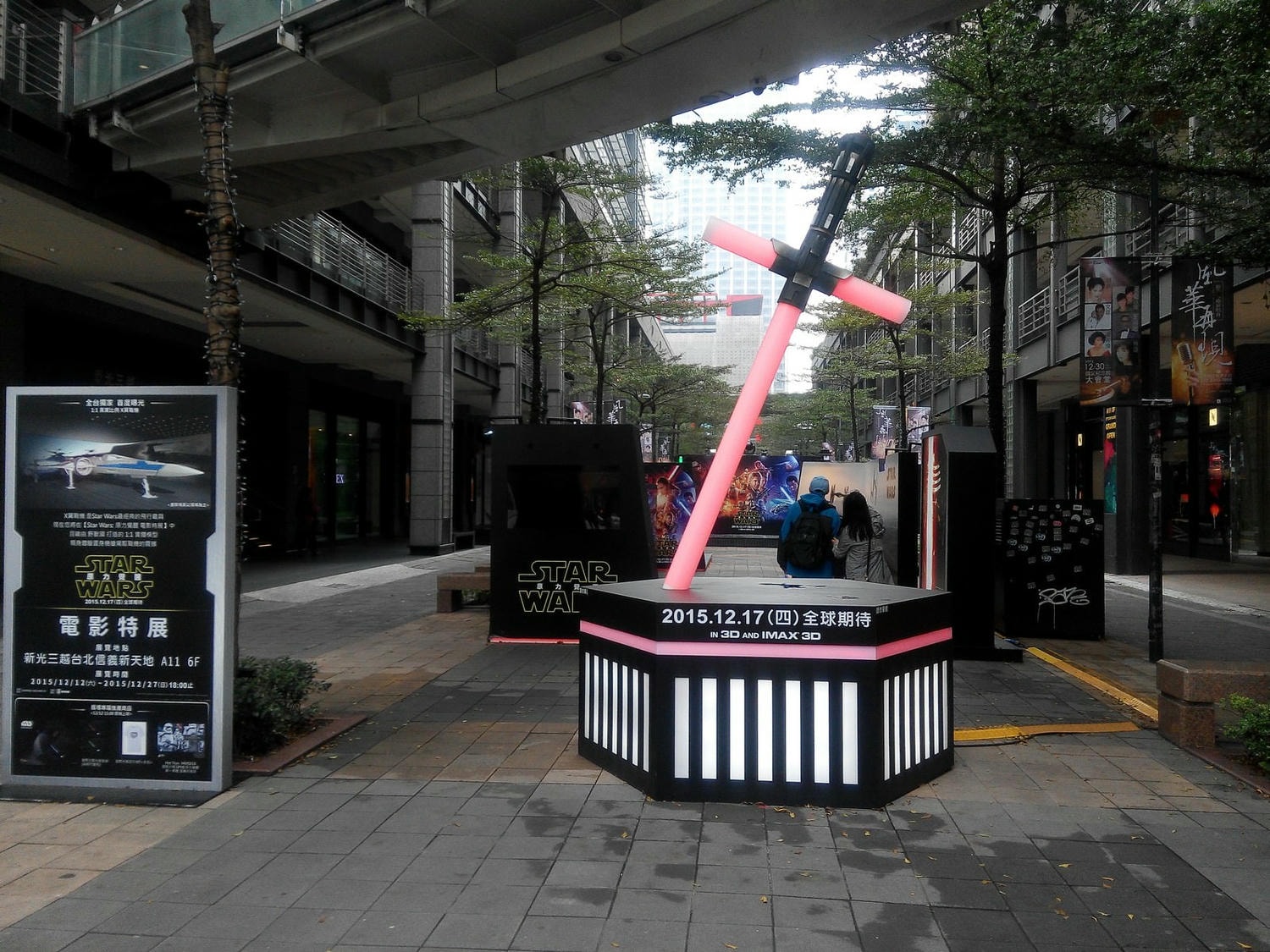 位於喜樂時代影城的光劍模型,單手拿其實比想像中還粗,兩把碰撞時會有音效。(補:電影下映後該看板已收掉)