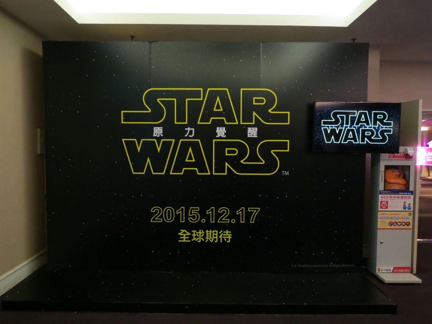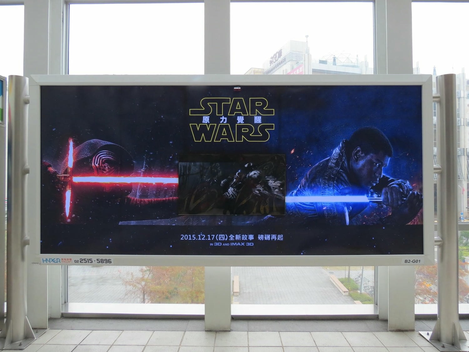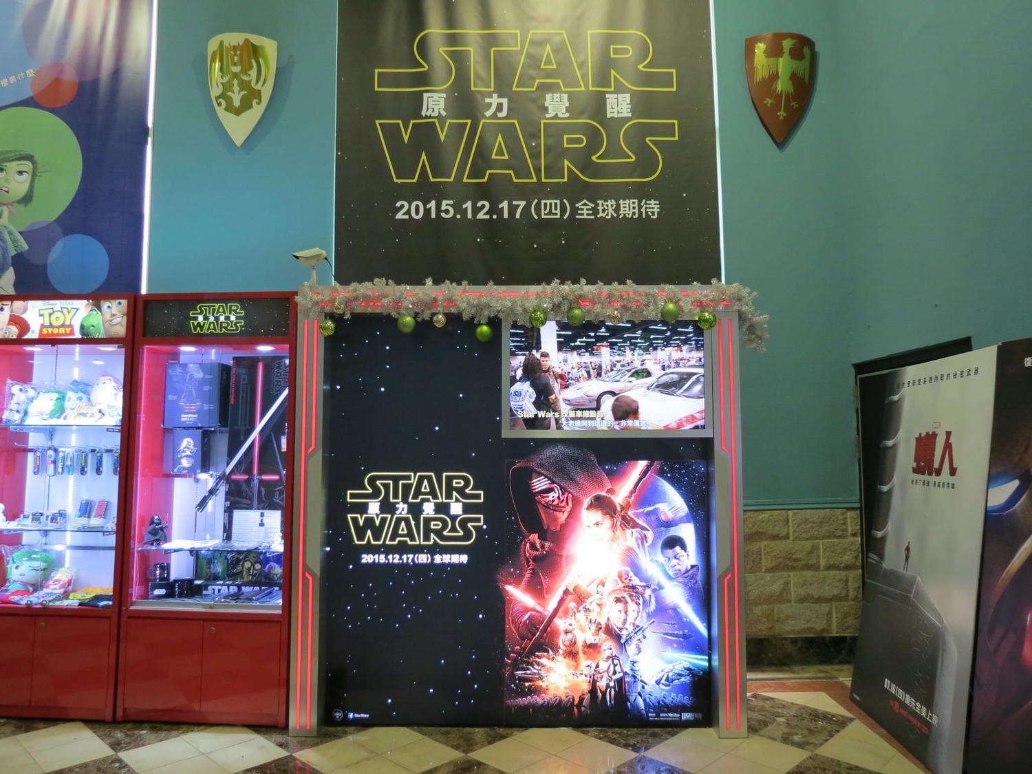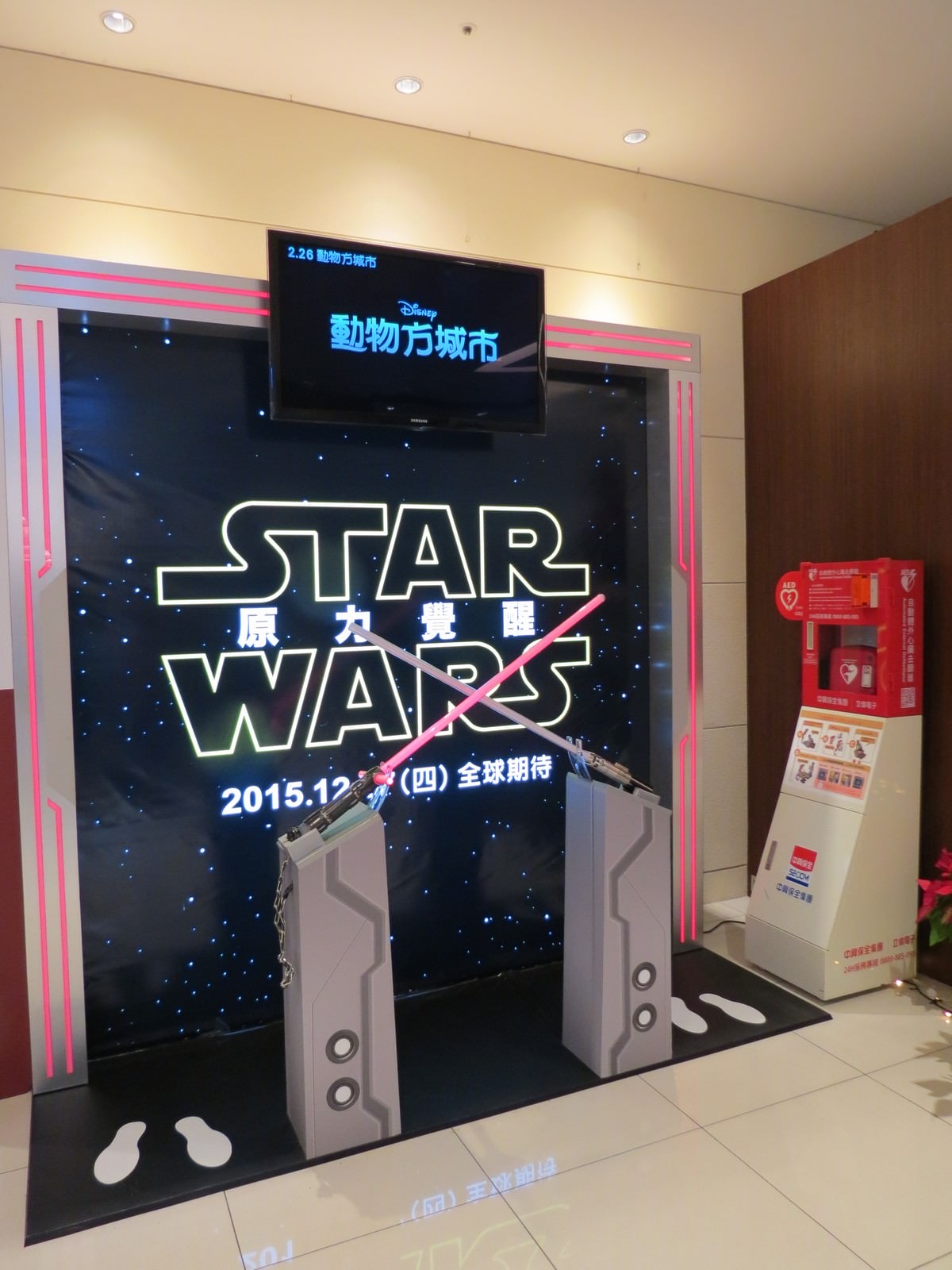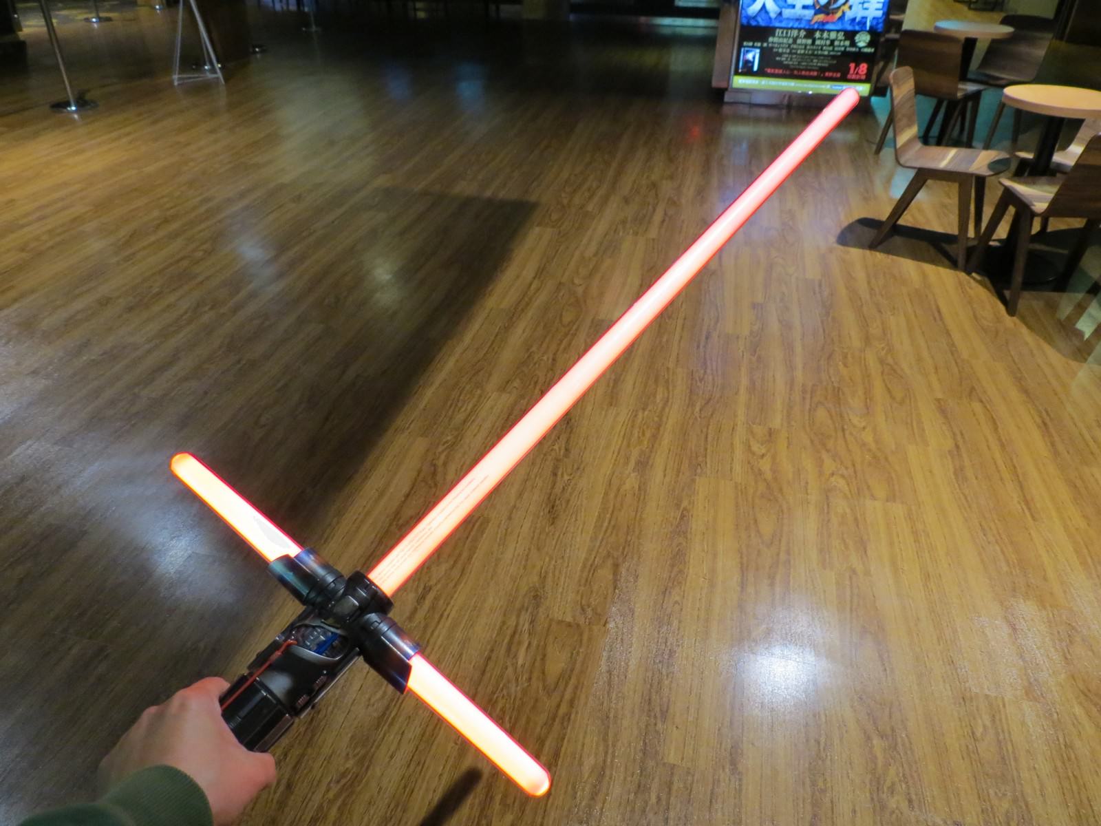 位於喜樂時代影城的光劍模型,單手拿其實比想像中還粗,兩把碰撞時會有音效。(補:電影下映後該看板已收掉)
