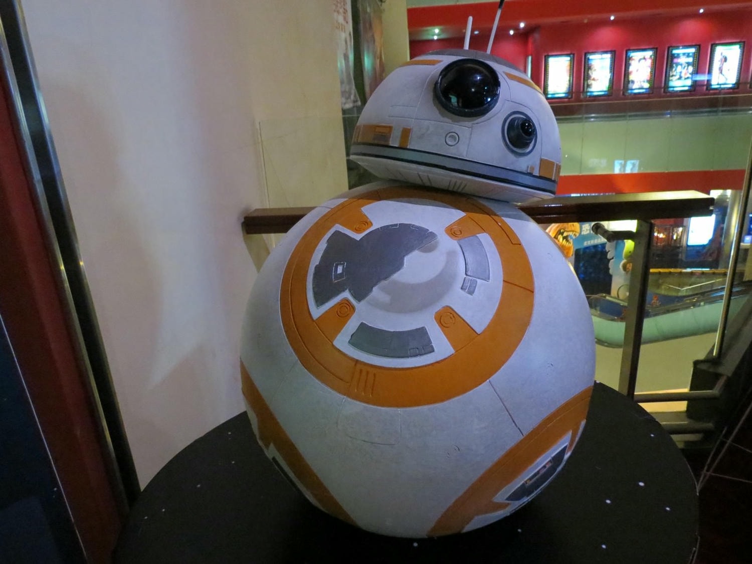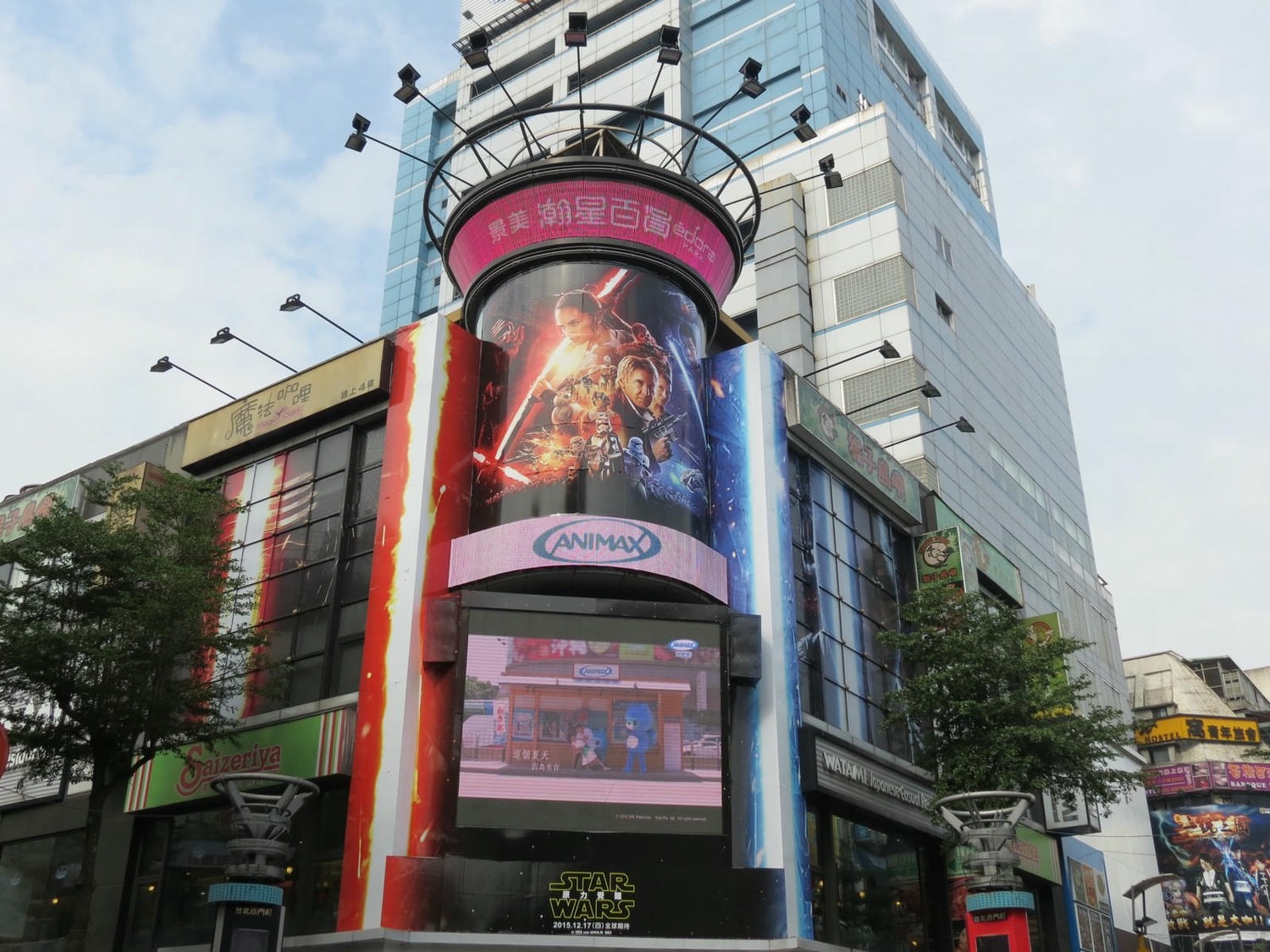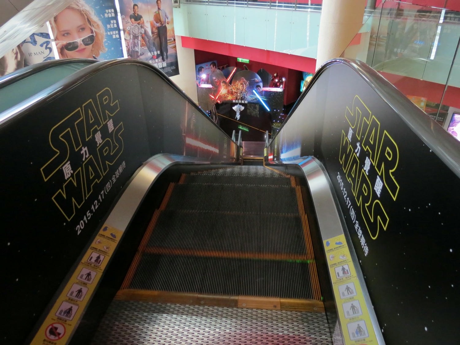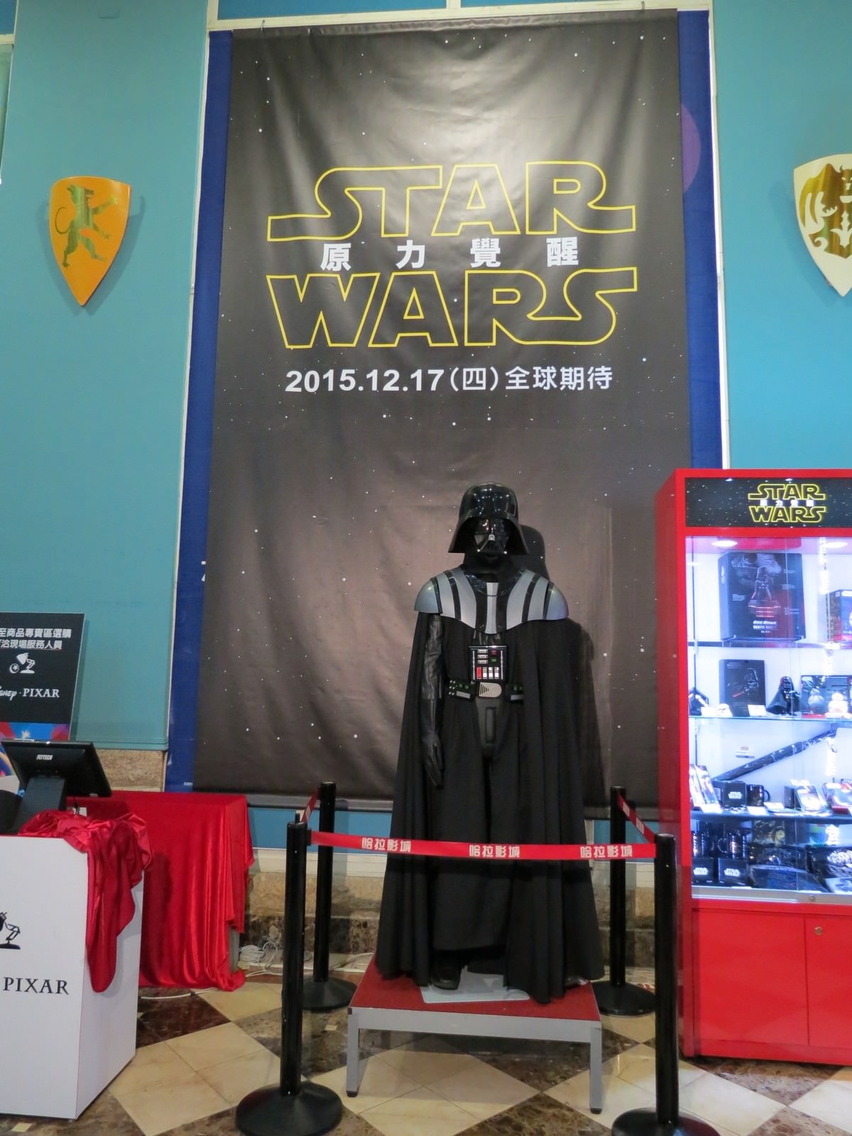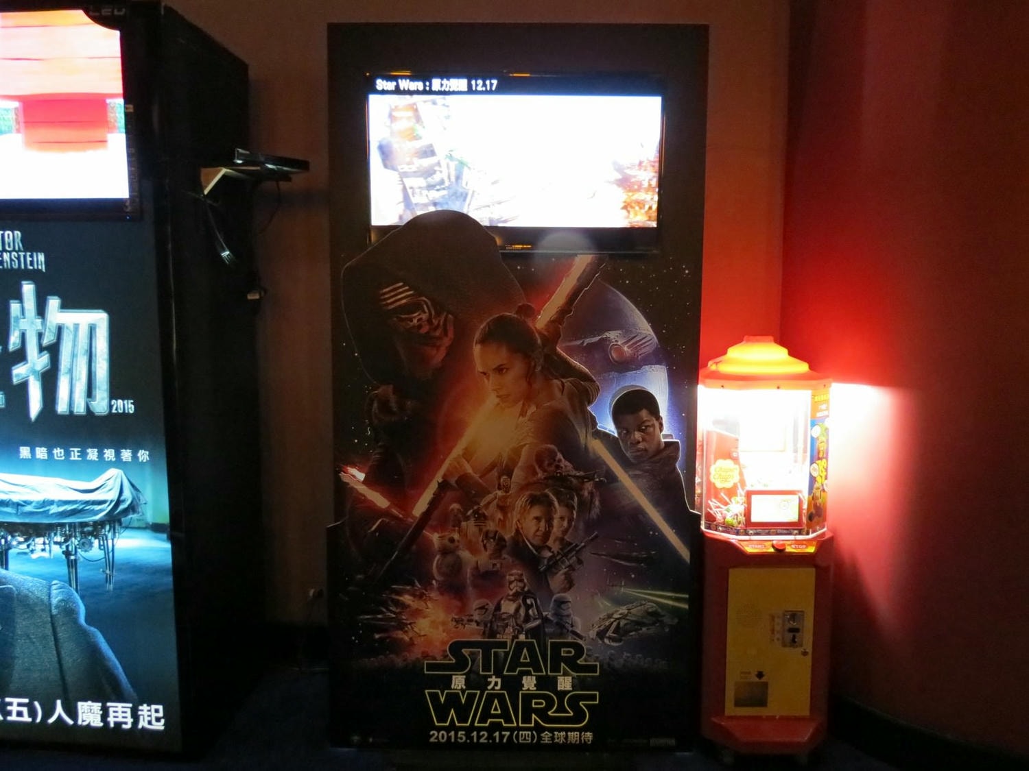 位於喜樂時代影城的光劍模型,單手拿其實比想像中還粗,兩把碰撞時會有音效。(補:電影下映後該看板已收掉)