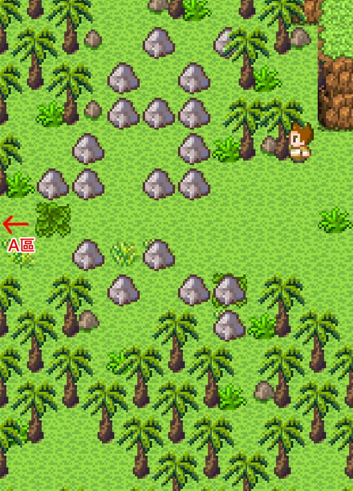 會進到一區都是石頭與椰木的地區,若往左邊走會發現這邊其實就是A區的右上角,但無法直接走到A區去。(正常攻略為:先在A區發現有這區塊,才想辦法找路過來的)
