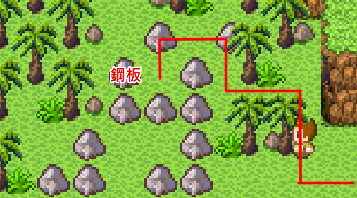 後來我發現有捷徑可走,沿著紅線走,第1顆擋住的石頭往上推、第2顆擋住的石頭往左推,藏著鋼板的那顆石頭往左推,即可取得鋼板。
