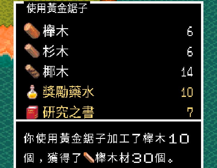 椰木跟杉木都可以用「斧頭」加工成木材,但櫸木需要用「鋸子」才行,雖然這個階段已經可以製作「鋸子」,而且是主線劇情必須製作的,但需要的材料很多,不用急著製作,等製作出「鎚子」後能較容易取得金屬類材料再製作即可。