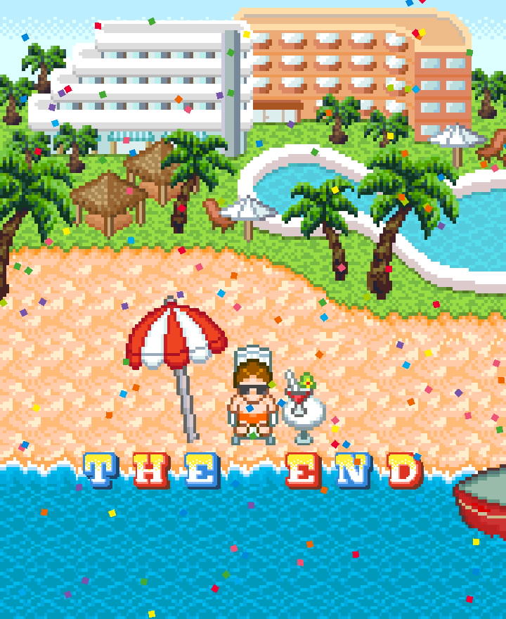 面對「小船」點持有物,選「神秘動力」,就會變成「豪華遊艇」,坐上豪華遊艇航行一小段距離後就會到渡假村,坐上椅子後,會掉下「THE END」字塊可以撿拾,並觸發「度假村的回憶」研究。