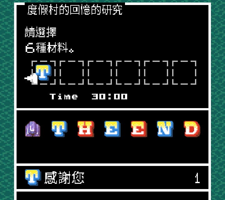 離開度假村後才能研究,THE END這幾個字的物品名稱分別為:感謝您、願意將、本遊戲、玩到最後。敬請期待、下一部作品!!!,研究後製作出來會是一杯雞尾酒,隱藏劇情的部份就到這邊。