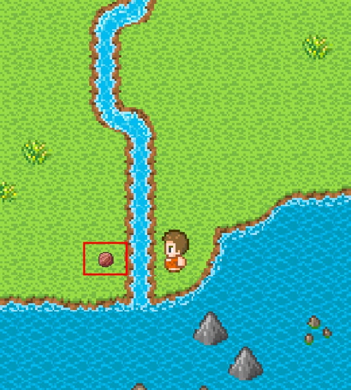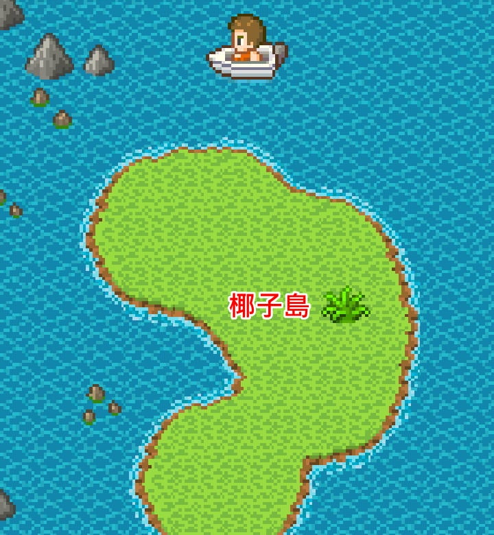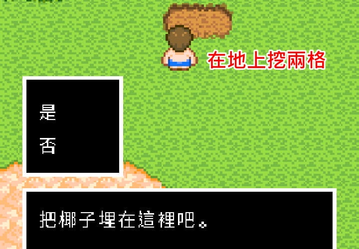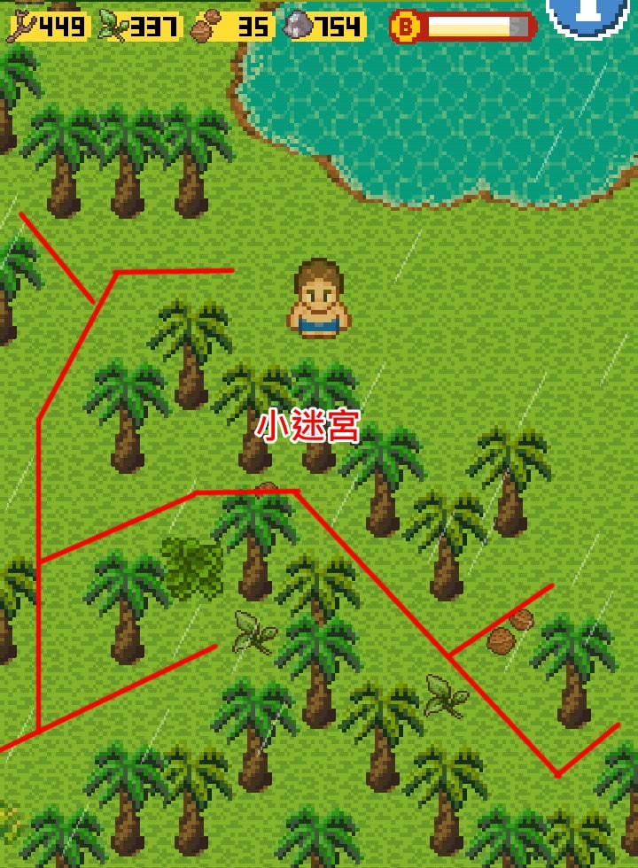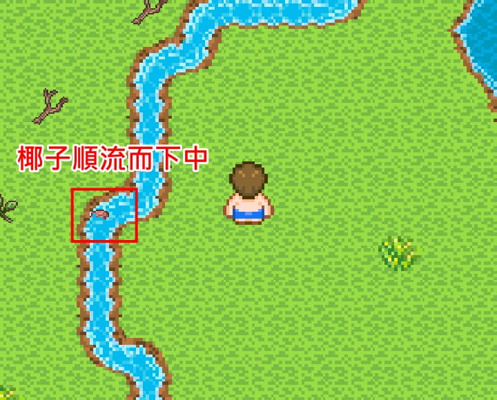 附註:順水流下的是「迷你椰子」,種樹取得的是「椰子」,兩者功能一樣,但若要完成圖鑑100%,種椰子後至少要撿拾過一次「椰子」才可以把樹砍掉。我本來想多種一顆椰子樹備用,但直至破關都沒能用上,椰子種一棵即可。