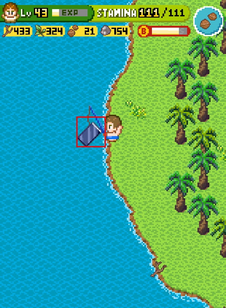 走到島嶼左側海岸時,會有一格在冒泡泡,在這遊戲中幾乎都是重要暗示,拿出釣竿來釣(用堅果釣即可),會得到「鋼板」。